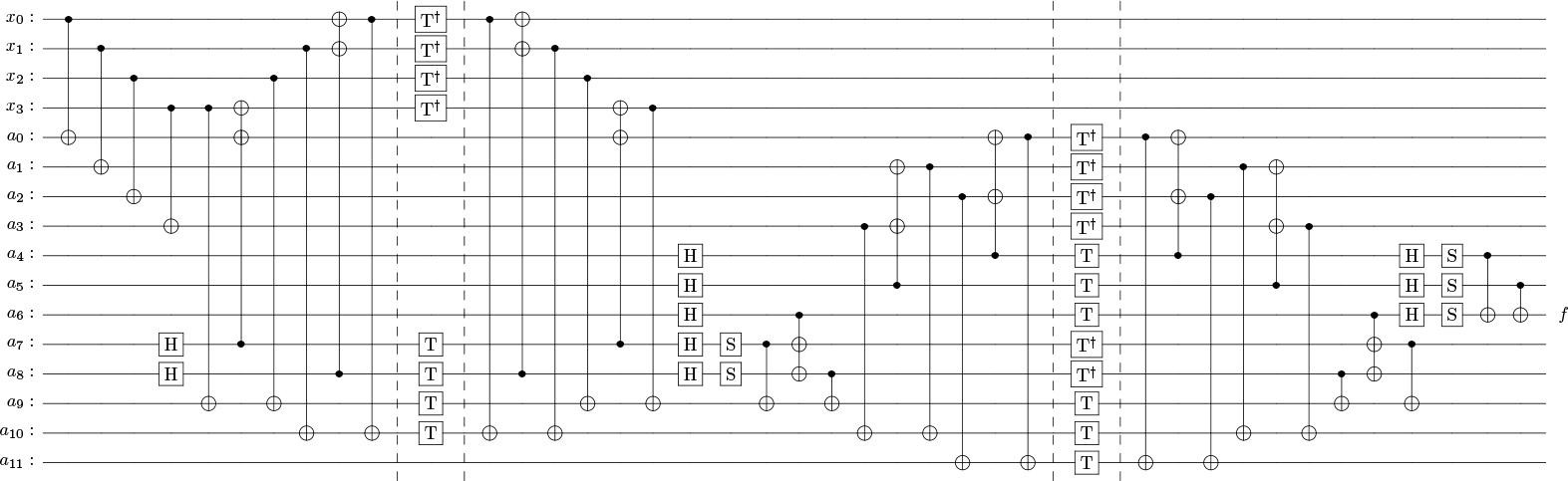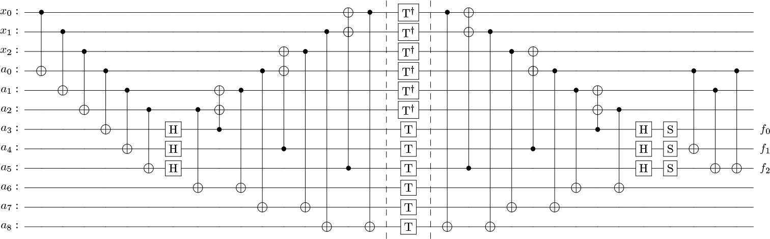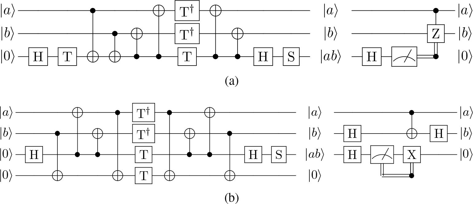 ![Toffoli decomposition with measurement-based uncomputation, using four T gates, (a) without using any ancilla qubit [20], (b) with a single reusable ancilla qubit [13].](https://sciendo-parsed.s3.eu-central-1.amazonaws.com/69b03f3073f0b3637a28372d/j_qic-2025-0032_fig_001.jpg?X-Amz-Algorithm=AWS4-HMAC-SHA256&X-Amz-Content-Sha256=UNSIGNED-PAYLOAD&X-Amz-Credential=ASIA6AP2G7AKHWVIK4OR%2F20260313%2Feu-central-1%2Fs3%2Faws4_request&X-Amz-Date=20260313T065145Z&X-Amz-Expires=3600&X-Amz-Security-Token=IQoJb3JpZ2luX2VjEL7%2F%2F%2F%2F%2F%2F%2F%2F%2F%2FwEaDGV1LWNlbnRyYWwtMSJIMEYCIQCmpjodvcCGbuMCOlFqerCkMsrZbsnjMscu9CMOrVrYOwIhAPHL5z41emb9UqZlvRMMiIXUVJyTQAvomRcIy4Ci%2BsrBKsYFCIf%2F%2F%2F%2F%2F%2F%2F%2F%2F%2FwEQAhoMOTYzMTM0Mjg5OTQwIgwvWVM5Y8f9dKcB0xcqmgW3o8zkc7TKIC%2FMqpnqj%2BgUa5VpAnsPxq2reHqfDqiWTph3fGHwZbiGxLZ%2Foxvi4j9rGkY94F94979YKnwhb30Em8AS1IotiAhMEFlo8feWmJkGnKDM%2FDcJCc9udpsWWHtx%2BxbRSzOxNnfOOwNOI6lBxRap69FckjQV6fH7royLVWV0oq1PuEACnhqNvQRWLciLNDXsKfBXGPpVkrxEcsUIiab7mxnF8xDEH%2BpUQGjo%2Bj59OsqakgAbq1rmYW%2FjE%2F5yZUipEDlCOJpU4zJNI4G7%2Bh2bI9JcFyfkMUs4kt8oxjKDCaUET45aSRgkyoZ1koLrzGHEs0UfVAdJmVrYyPyxyGLnR%2Fs8YEIa9iCRcEIaynDomInBMTvdUSbu5v8XgEL24FqeWtXmPYRsgAoa1iBYJOMGlXSjOs2W1PE4xAjE3CiL6nvizd52w7GjxBZnVmU3s2Z4XOJBZs8TkfARZVQ%2FAhSS5OzZhl2rAVY44gLESQfFFkrD38Eg54y8lbzO6el4M5IBoF78jH1%2Fw%2F086d07gc1tptUXkr%2Bl71jKKaRt5or3nL%2FAi83PC6g8Te9N0cI7Xu5WDS3eDSEIDOlAqaEY%2FJgaJOUA%2Bb40XcE2tTtXDY43NP%2BHueabNCVaiPHlKdrLvP3FoIy9G8BxdqrSTd27YAMfvCWC35rcVi%2BOrU%2F9KCgRn0MCBkrOJq5w3%2B2h7DQHPGlf%2BBu2YAp0E%2BT2gKs2tLdesxJh4qZL%2FxR5KsP79Sr1vC6h0EqTOpRdZQt%2FiDJuW8w9Fl3D2U54TLy5Jlzne8azK%2BxUimtw9emjyIv%2BoqFjxnRyoU92c0A%2B6eDR9NP1oHIYwpldXbMfhyHjnmaQkcTQq%2BdlZSm4QO6rmNdH3bL6sL1U0S4HGBsw4MjOzQY6sAF2WXET%2F37Yd%2BxNy%2BAtlD3IkSxvu2DaGiQ4h%2BoLr%2Br%2B02b%2FyzFa5d9JIVA08PxCq5VwjCBQ56zlNUvpExqSWojrll9x74j%2FaEYN29DYX5Erspyd3VfrR4yJu64pbyPG6pyh14Qfsf6c8jnGYl9SomrAgEh1%2Fs39KMfHJrhPZ9h3tzSZR6a0%2FPTdlcBn6XbQ5%2FUGC7BtSsaxzJXPpy2WeocVjQtZ6I0EDyn616Zpa%2FI2Og%3D%3D&X-Amz-Signature=bb1e00c49f4d0ef381b3bdea2dd84febc739e3b209f8ff6a057042778907899f&X-Amz-SignedHeaders=host&x-amz-checksum-mode=ENABLED&x-id=GetObject)