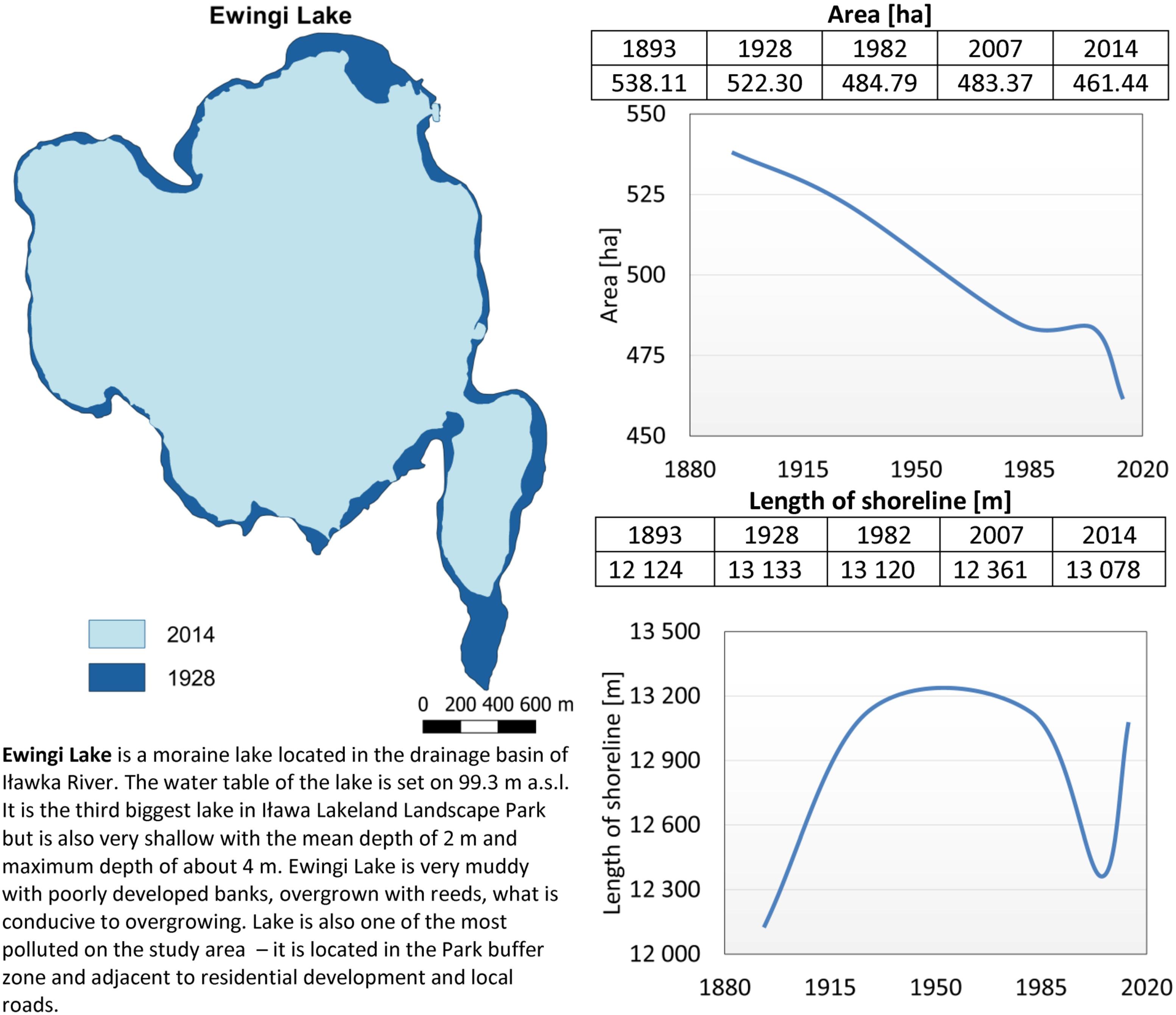The last stage of the analysis was visualisation of spatial data. It is essential for determining characteristics of changes of inside the lake systems. The results of conducted research was visualised through cards of lakes prepared for all lakes with area greater than 15 ha. The exemplary card, prepared for Ewingi Lake is presented on Fig. 3. The card constitute a comprehensive summary of information about lake that includes information about the area, length of shoreline, average and maximum depth and degree of changes in period of over 120 years.
