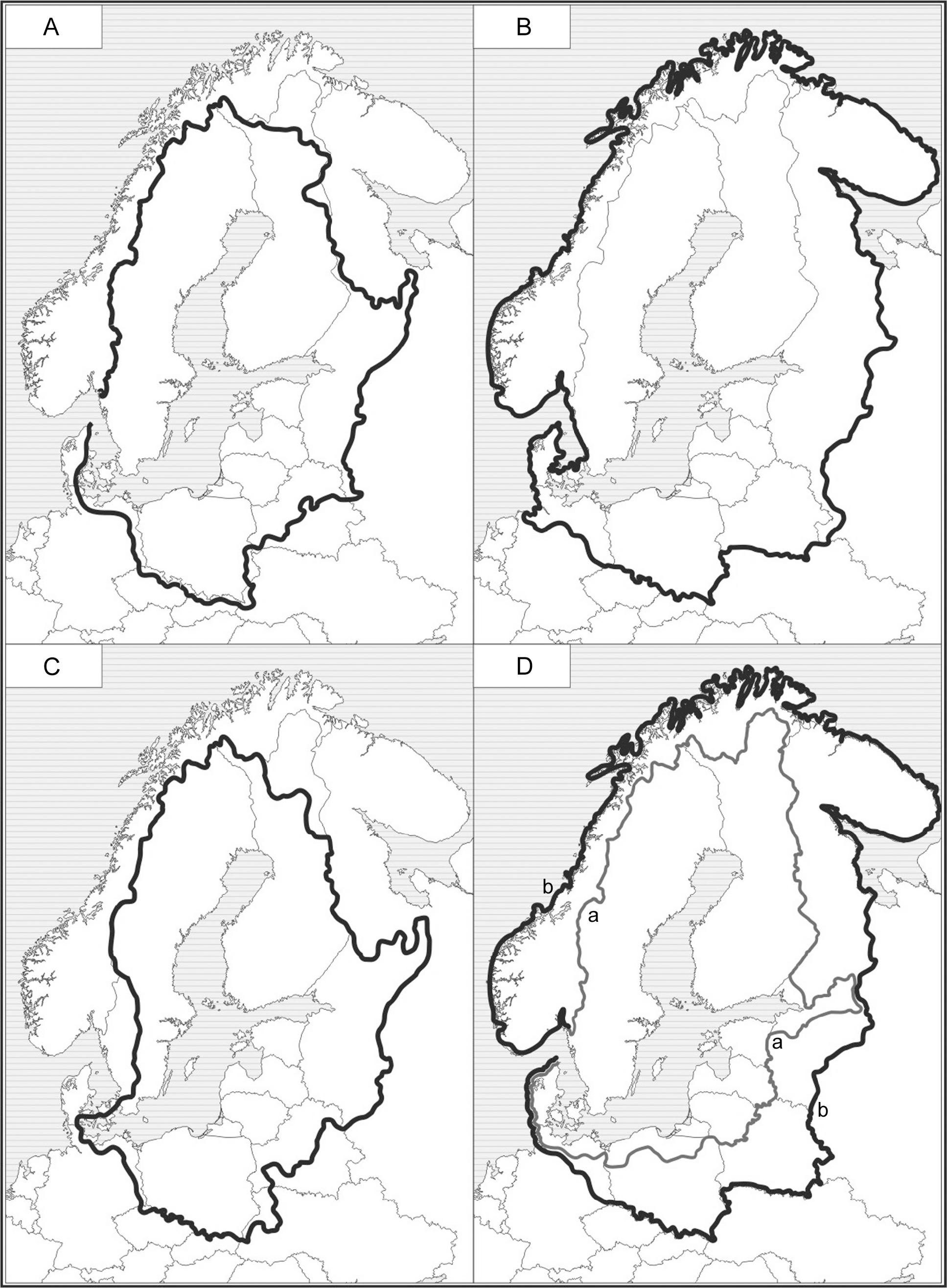 The delimitation of Baltic Europe: (A) catchment area of Baltic Sea, (B) Wizje i strategie… 1994, (C) Buchhofer 1997, (D) Palmowski 2000 – (a) core area, (b) extended area.