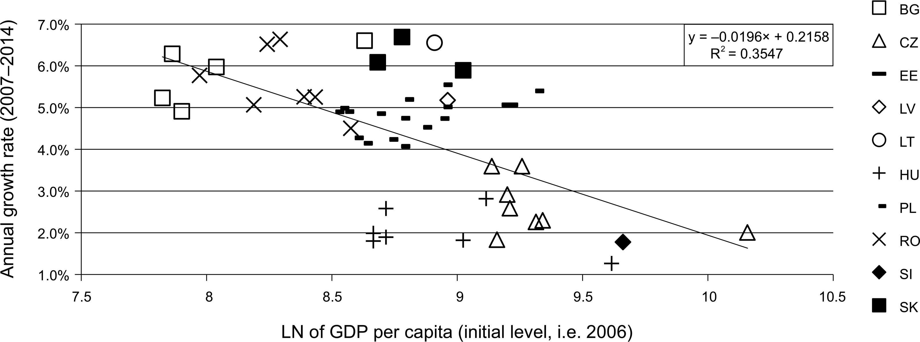 Let us briefly describe the position of regions of CEECs within the EU, especially through comparison with the ‘old’ EU countries (EU-15). As shown in Fig. 3, the levels of GDP per capita (in EUR) were lower in CEE regions before the 2007–2013 programming period. However, the average annual growth rates of CEE regions between 2007 and 2014 were generally much higher. The performance of all CEE regions rose, while many regions reached the average annual growth rate of between 4 and 7%. At the same time, the regions of the EU-15 rose slower or even declined (especially the regions of Greece, Spain, Italy and the United Kingdom). These simple facts show that the gap between the economic performance of EU-15 regions and CEE regions decreased. In particular, these facts play an important role in the convergence process across the EU-27 regions that result from a negative slope. We have to point out that, based on the coefficient of determination, this model has been found to be significant at the 0.01 (t-test has been applied to resolve the statistical significance). In addition, the model estimates the average ‘speed of convergence’ across the EU at 1.83% per year. In general, the findings of catching-up process of CEECs towards the EU-15 are in one line with other recent studies (Matkowski et al. 2016; Dobrinsky, Havlik 2014), and help to accept the first hypothesis.