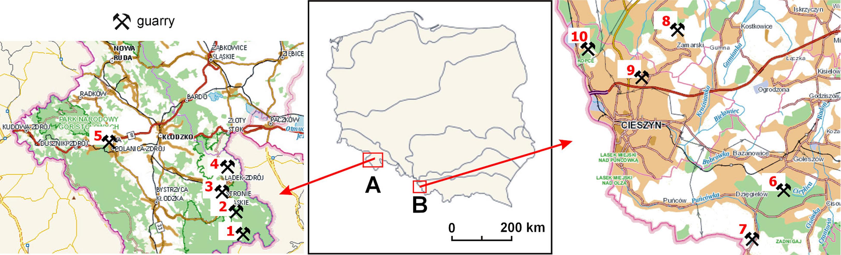 Location of the selected quarries in the Kłodzko Region (A) and Cieszyn Foothills (B). 1 – Kletno, 2 – Krzyżnik, 3 – Sinica, 4 – Czarne Urwisko, 5 – Szczytna Zamek, 6 – Na Jesieniowej, 7 – Na Mołczynie, 8 – Grota na Rudowie, 9 – Nad Kalembianką, 10 – Ondraszkowa Dziura.