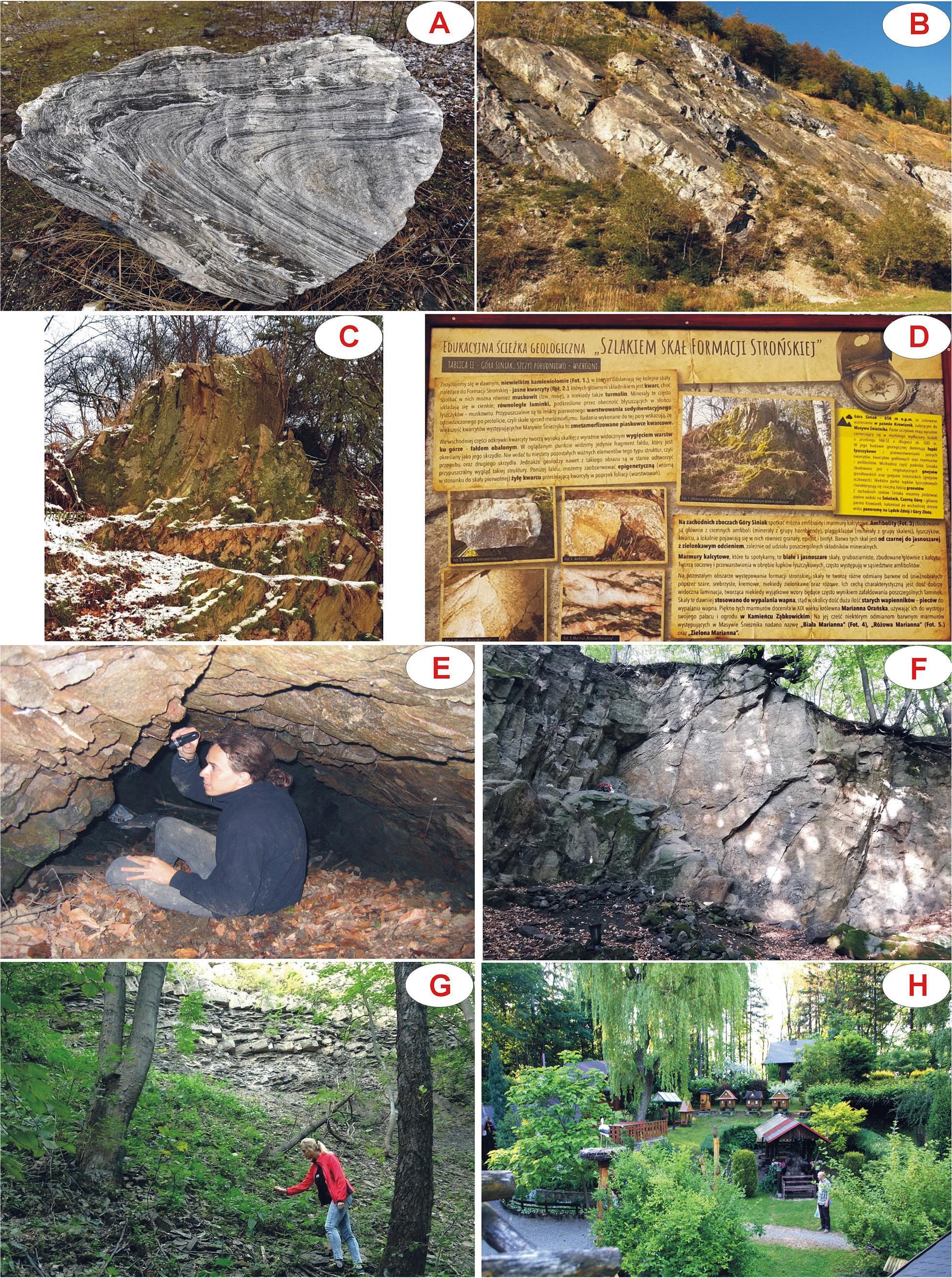 Examples of geological structures and tourist infrastructure in the quarries. A – Krzyżnik, B – Kletno I; C, D – Sinica, E – Ondraszkowa Dziura (adit of teschenites), F – Grota na Rudowie, G – Na Jasieniowej, H – Na Mołczynie.