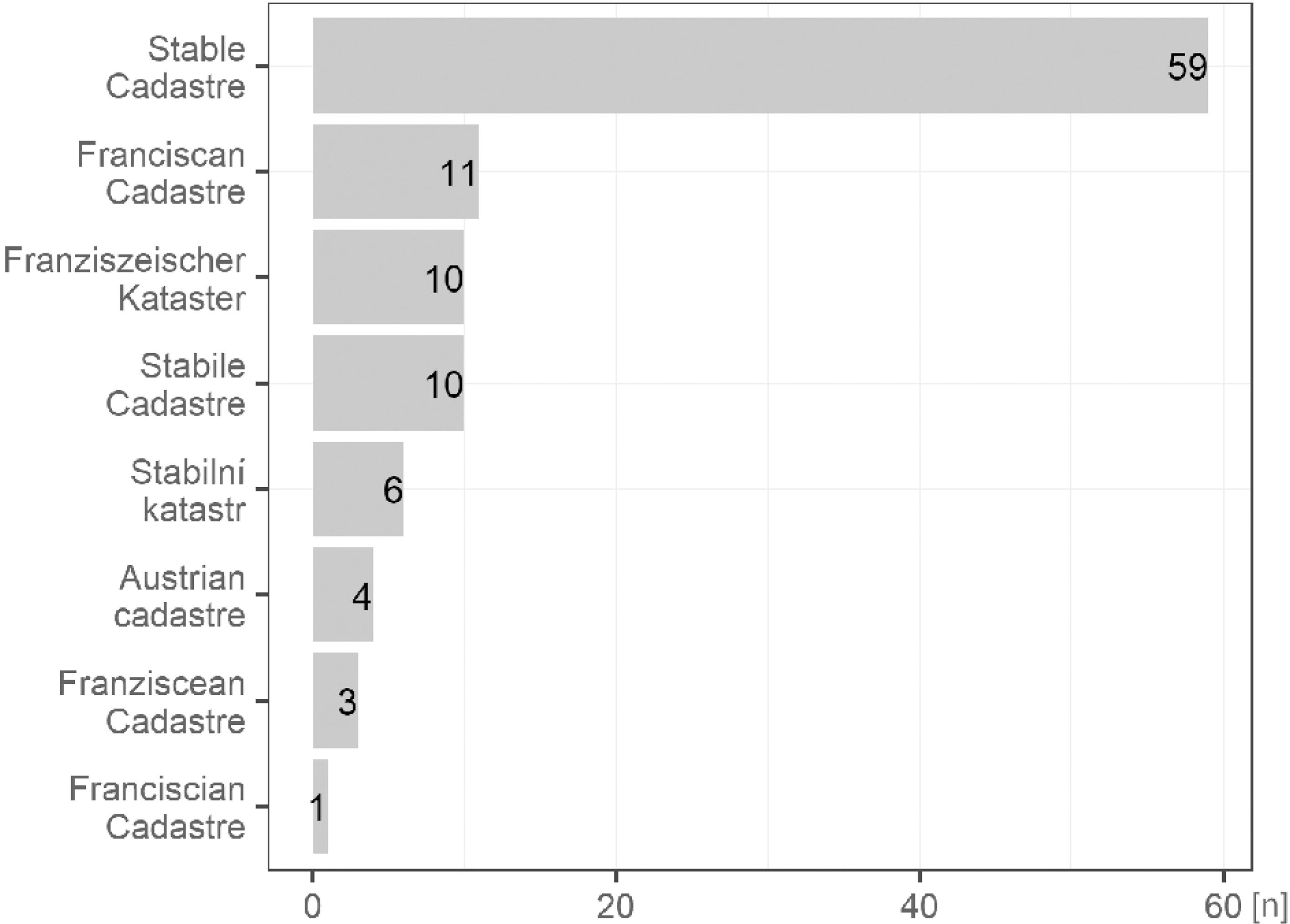 The majority of records localised to Czechia consenting with the frequency of the terms used for the retrieval of the record (Fig. 2). There are significant differences between the frequency of use of Stable Cadastre (which is used mainly in Czech and Slovakian records) and the other keywords such as Franziscean or Franciscan cadastre. In order to cover the other possible keywords associated with Franziscean cadastre source, we applied the German and Czech translation involved (e.g. Franziszeischer Kataster, Stabilní katastr, see Supplement 1 for full list) resulting in less than ten records. The Czech term Františkánský katastr appeared in the preliminary stages of the initial search, but there were no eligible studies in the final subset of 104 records.