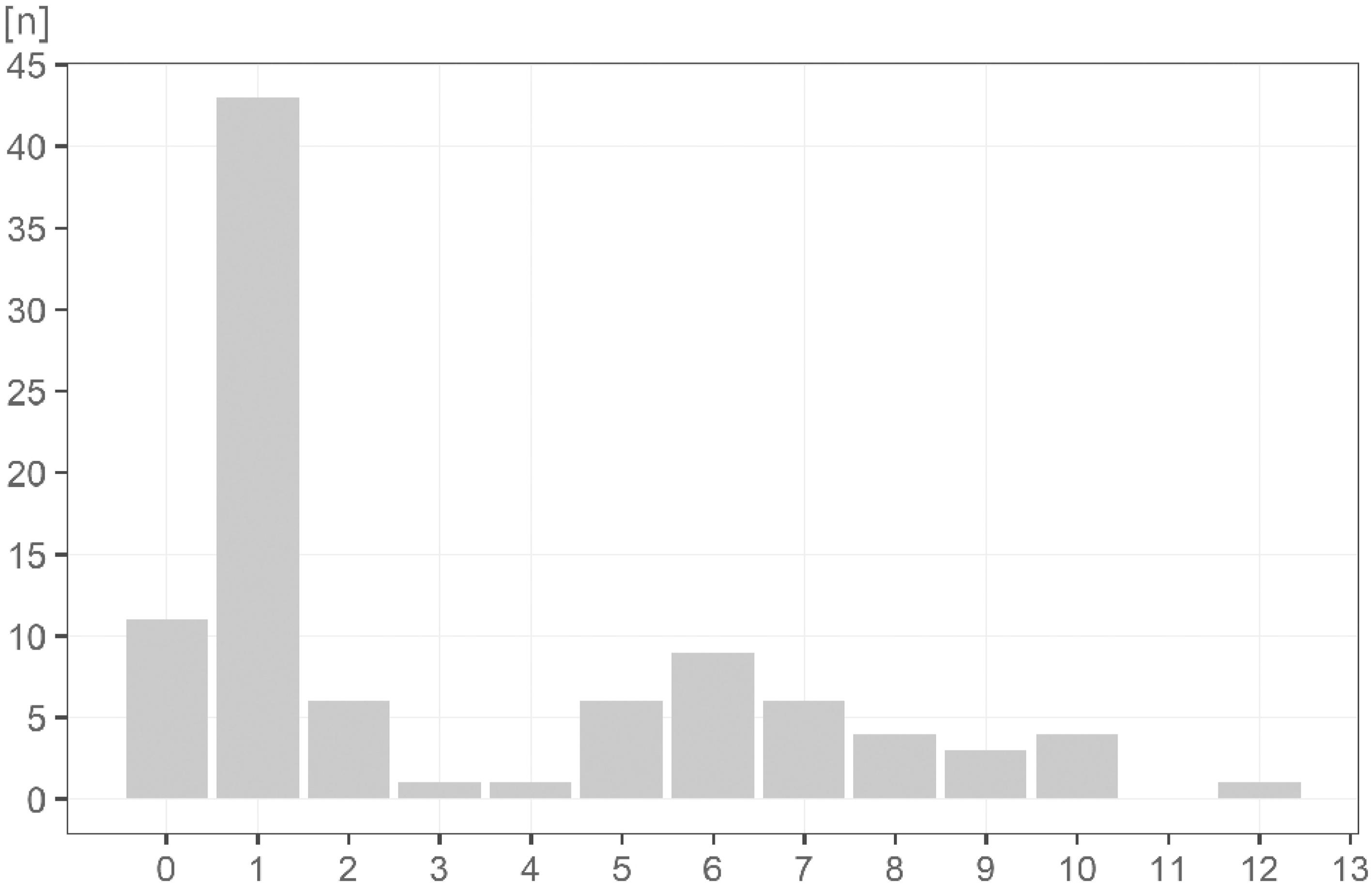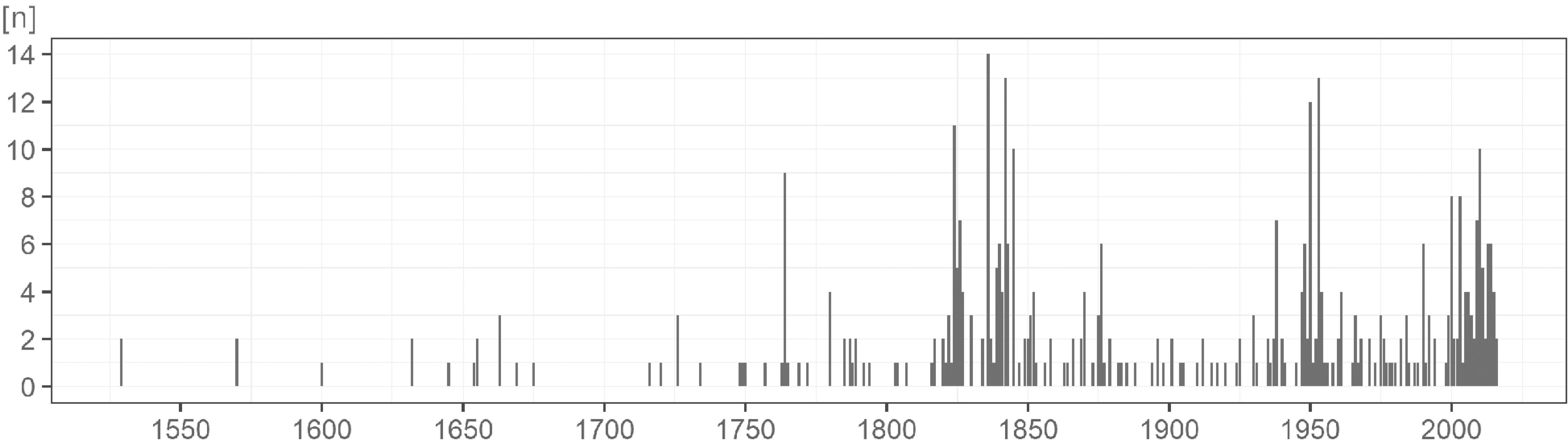 Similarly, to the distribution of the origination date of the data, the distribution of the number of time points included in the records (Fig. 4) speaks for the most frequent use of three time points. The frequency of time points decreasing towards higher numbers of time points applied. As regards the outliers, we found 10 records with just one time point. These studies are mostly based on written registry records (or protocols) reconstructing the past pattern or societal demands. On the other hand, there were studies that gathered more than ten chronological data sources. These outlying records are represented by outcomes from extensive projects or detailed idiographic research in small scale but with an attentive historical sources search in both cases.