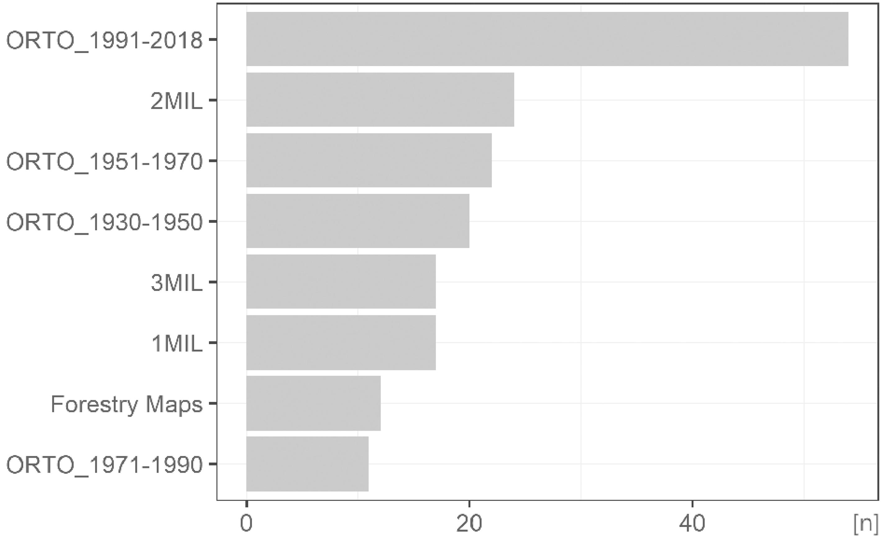 The most frequent group of other (complementary/main) sources used in the records were orthophotomaps or aerial imagery in the case of older sources (Fig. 7). For the sake of clarity, the orthophotomaps used in the studies were grouped into intervals according the periods of their origin (1930–1950–1970–1990–2018). The last period of 1991–2018 was involved in most cases (n=54), followed by the periods of 1951–1970 (n=22), 1930–1950 (n=20) and 1971–1990 (n=11). The second major group of other sources formed maps of old Military mapping (1st = 16, 2nd = 23 and 3rd= 16). Lastly, we have found a group of 12 records reporting the use of forestry maps of a different age.
