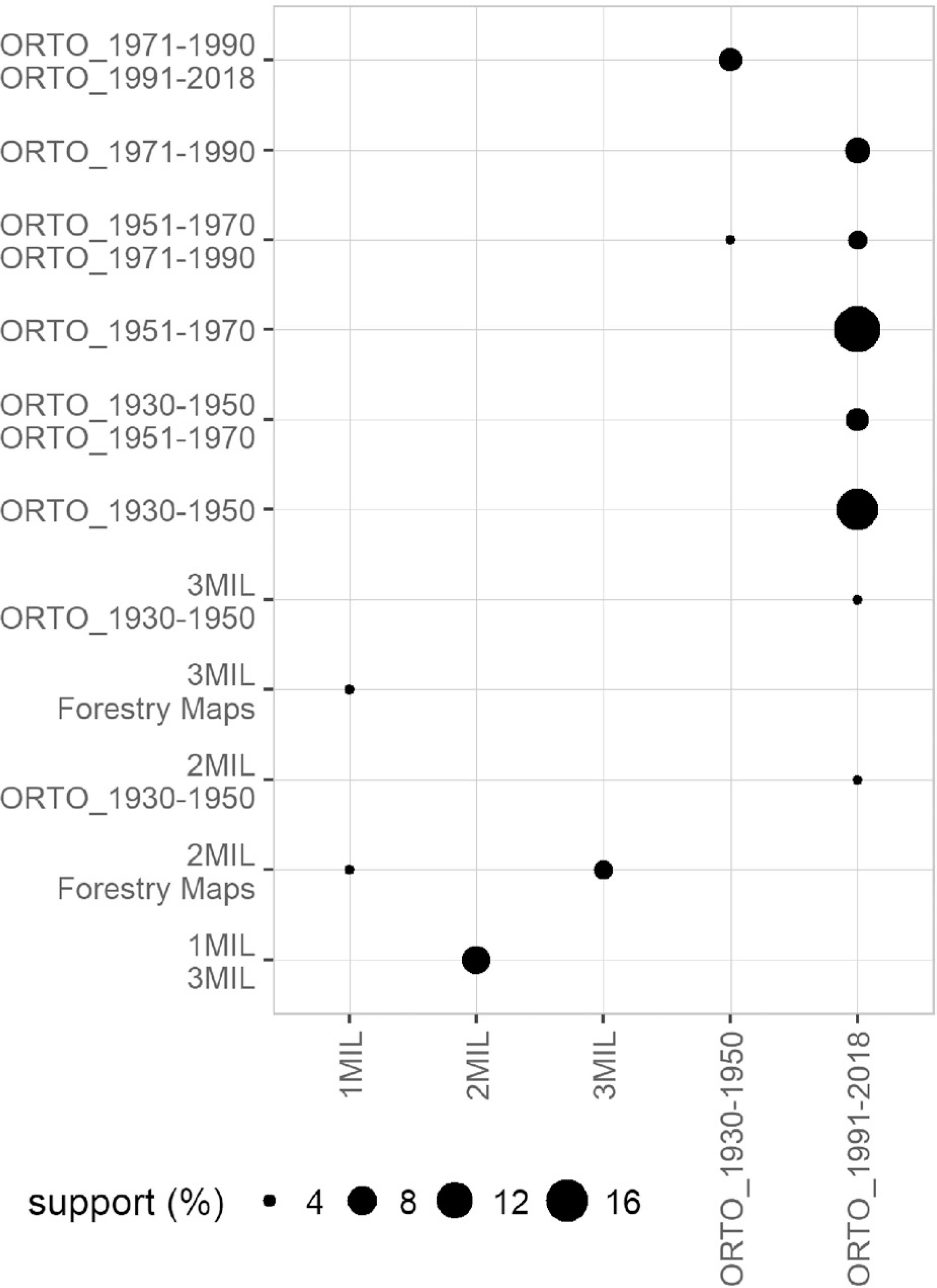 Figure 8 shows the share of the particular combination of the individual sources (e.g. 8% of the records use data from Franziscean cadastre together with II. Military mapping and combination of the I. and III. Military mapping. Concerning the other data and map sources, the exploration of the association among particular sources resulting to the most common combination of Franziscean cadastre with current (ORTO_1991–2018) and older (ORTO_1951–1970; ORTO_1930–2050) orthophotomaps. Up to 10% of records used any combination of older and current orthophotomaps (see Fig. 8) and a combination of the Franziscean cadastre with maps of Military mapping.