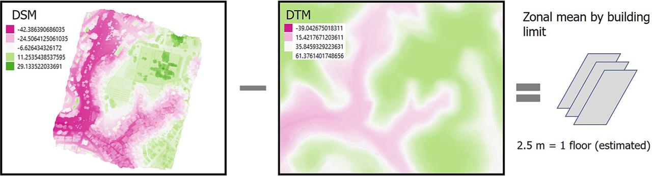 | Building floors | From the terrain and surface models, it was possible to identify the approximate number of floors of each dwelling. Information is available on Figure 6. |