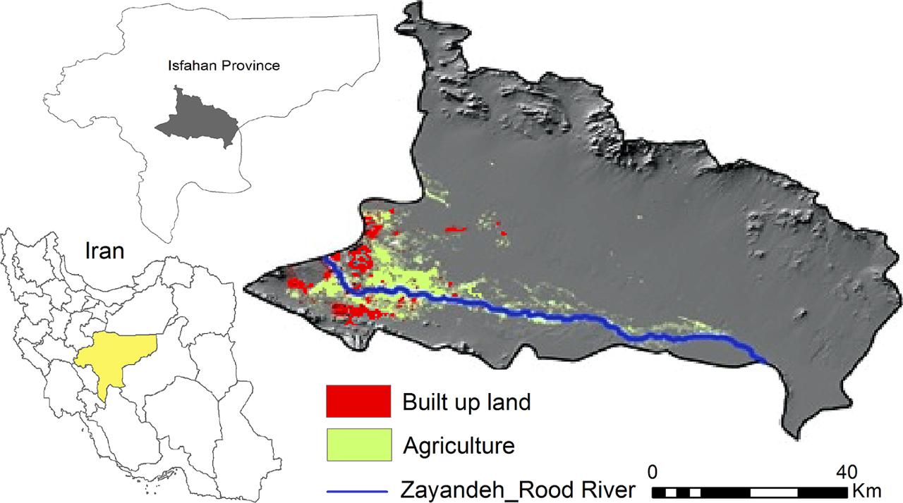 From a climatic point of view, this region is characterised by an arid and semi-arid climate with cold winters and dry, hot summers. Precipitation is rare but mostly occurs in late fall and winter and ranges from 50 to <150 mm (Iranian Bureau of Statistics 2011). Crop production is the main use of land, located exclusively near the river. More than 160 thousand people have inhabited this area which due to its adjacency to the Isfahan city – the third-most populated city of Iran near the northwestern boundary of the region – are growing at a high annual rate of 1.6% (Iranian Bureau of Statistics 2011). Due to the recent multi-year severe drought in central Iran and the consequent sharp decrease in freshwater supplies, agricultural activities have now massively shifted towards crops with fewer water requirements such as wheat. Figure 1 illustrates the layout of the Segzi Hydrological Unit in Isfahan Province, central Iran.