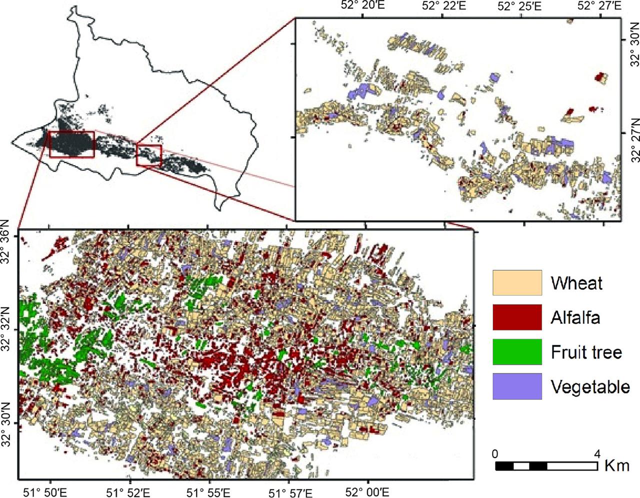 Wheat, barley, alfalfa, fruit trees and vegetables (including sugar beet, lettuce and cabbage) were recognised as the main crop types through field surveys and interviews of local farmers and experts. From the standpoint of growth stages, wheat and barley (hereafter only termed wheat) and alfalfa begin to grow clearly in early March when the mean daily temperature reaches above 10°C. Soon after in mid-March, fruit trees start to grow new leaves. In late April, alfalfa and fruit trees reach their full growth. Wheat matures by mid-June and is totally harvested across the region. In July, some new fields are selected to grow vegetables. At the beginning of fall, farmers start to harvest vegetables and then fruit trees and alfalfa start hibernating for the winter season. This cropping system is repeated annually in this region (Iranian Bureau of Statistics 2011).