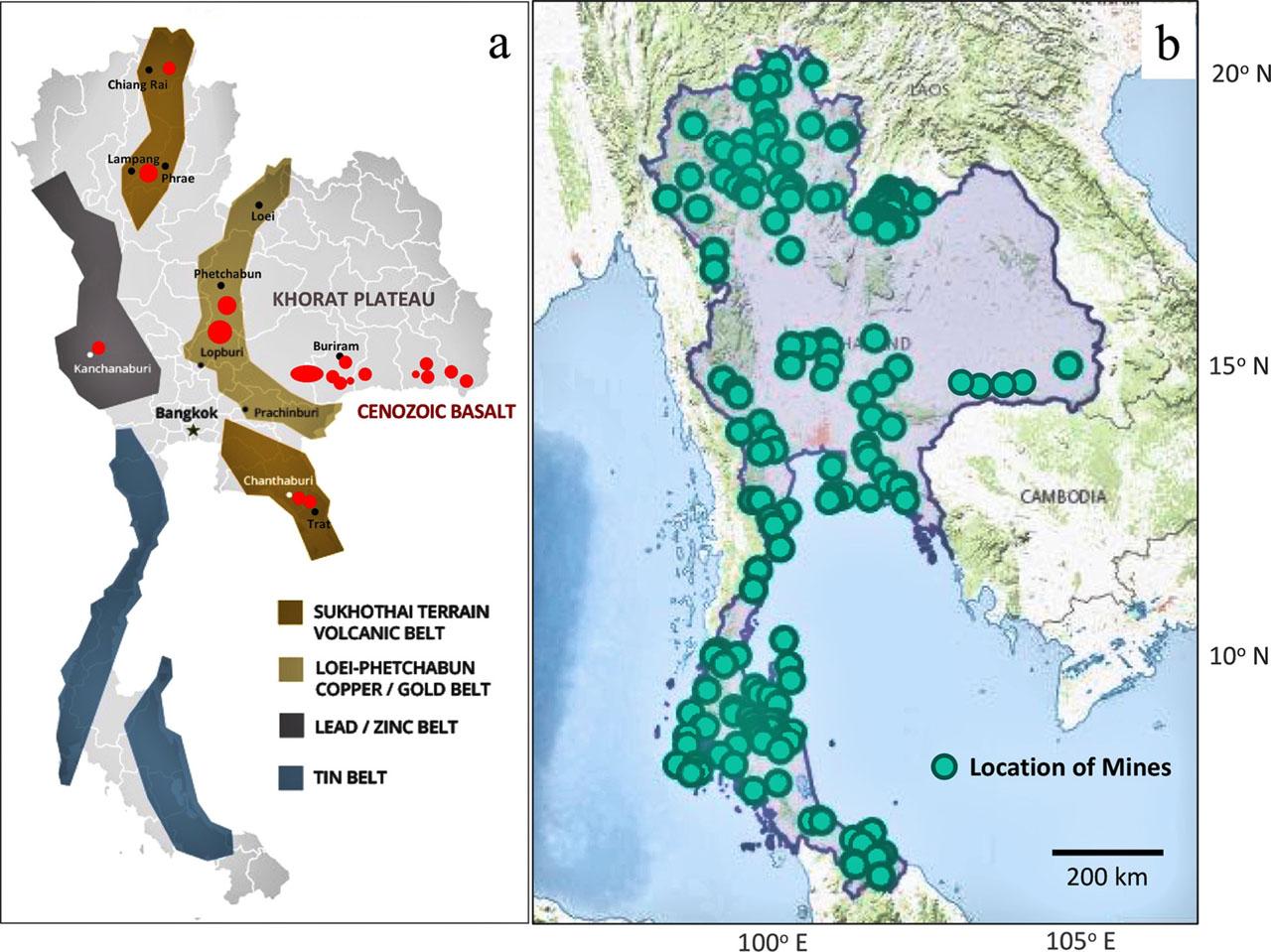 a – Thai metallogenic belt and b – location of mining in Thailand (modified from The diggings© program and data from USGS (2021)).