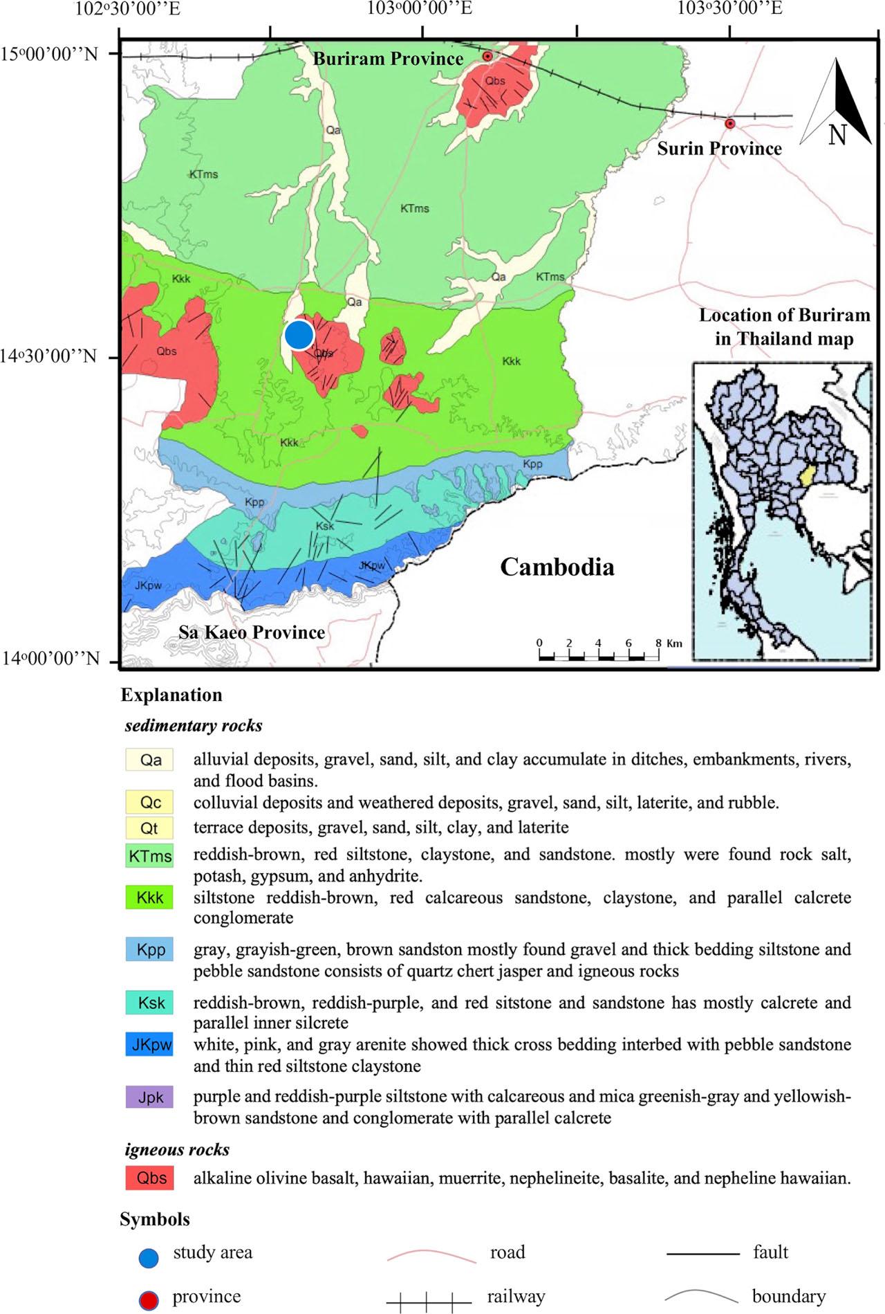 The Nang Rong Columnar Jointed Basalts is located at Ban Khok Makha Ron, Sadao Sub-district, Nang Rong District, the southern part of Buriram province. Field observations and literature reviews (DMR 2007) suggest that sedimentary and igneous rocks are distributed in the studied area. Khok Kruat Formation (Fig. 2) is composed of sedimentary rocks consisting of reddish-brown and purplish-red sandstone, siltstone, mudstone, and rounded pebbles. Cal caliche is found at the top of the mudstone. This formation is distributed in the east–west strike with a subhorizontal dip to the north, conforming with the Phu Phan formation on the top. Igneous rocks are found as only basalt rocks with dense, vesicular texture, and some of them are amygdaloidal texture, flowed over Khok Kruat Formation. Geological structures in the area are classified as fault, fold and unconformity (Fig. 2).