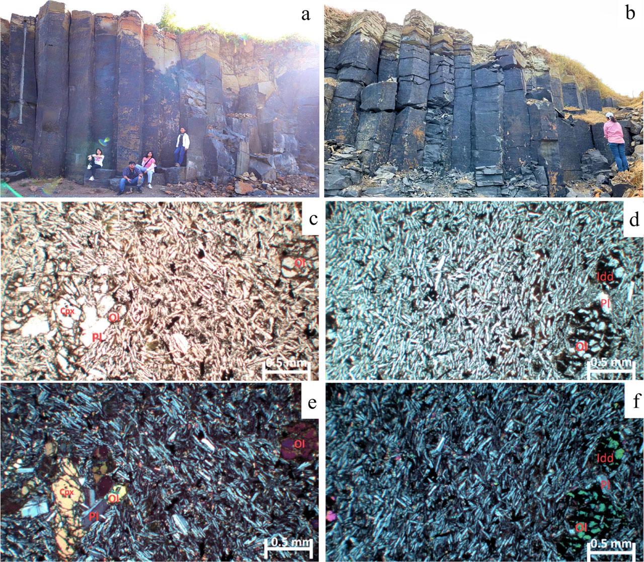 Outcrop of Nang Rong Columnar Jointed Volcanics a – columnar joint, b – platy joint. The photomicrographs of olivine basalt showing porphyritic texture c – columnar basalt in Nang Rong Columnar Jointed Volcanics in plane-polarized light, e – crossed polarized light, d – platy basalt in Nang Rong Columnar Jointed Volcanics in plane-polarized light, f – crossed polarized light. Ol, olivine; Cpx, clinopyroxene; Pl, plagioclase; Idd, iddingsite.