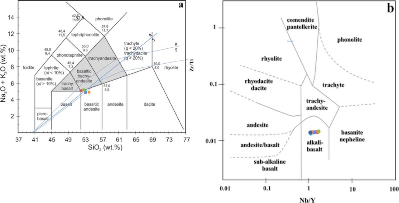 The geochemical analysis identified four selected samples in the study area are shown in Table 1. Major oxides (Na2O + K2O related SiO2) were used to identify the rock name, suggesting that one of Nang Rong Columnar Jointed Basalts (3AA) is basaltic trachyandesite. Three samples of Nang Rong Columnar Jointed Basalts (4AA, 5AA, 6AA) were basaltic andesite (Fig. 4a). Moreover, trace elements (Zr/Ti related Nb/Y) determined that all samples were alkaline basalt (Fig. 4b).
