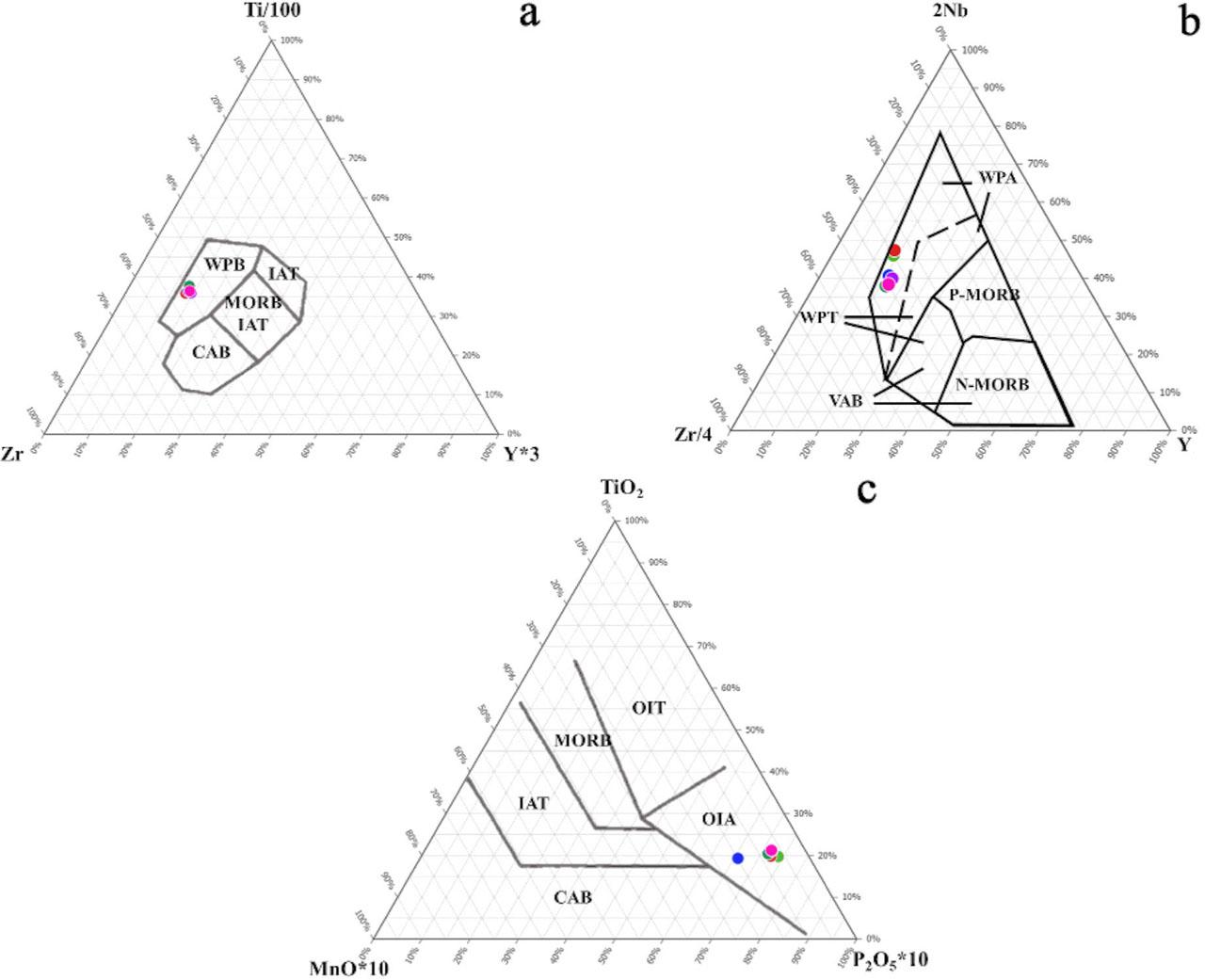 The discrimination diagrams for the studied rocks; a – Ti–Zr–Y diagram, b – Nb–Zr–Y diagram, and c – TiO2–MnO–P2O5 diagram (diagram modified from Sun, McDonough 1989, Pearce, Cann 1973).