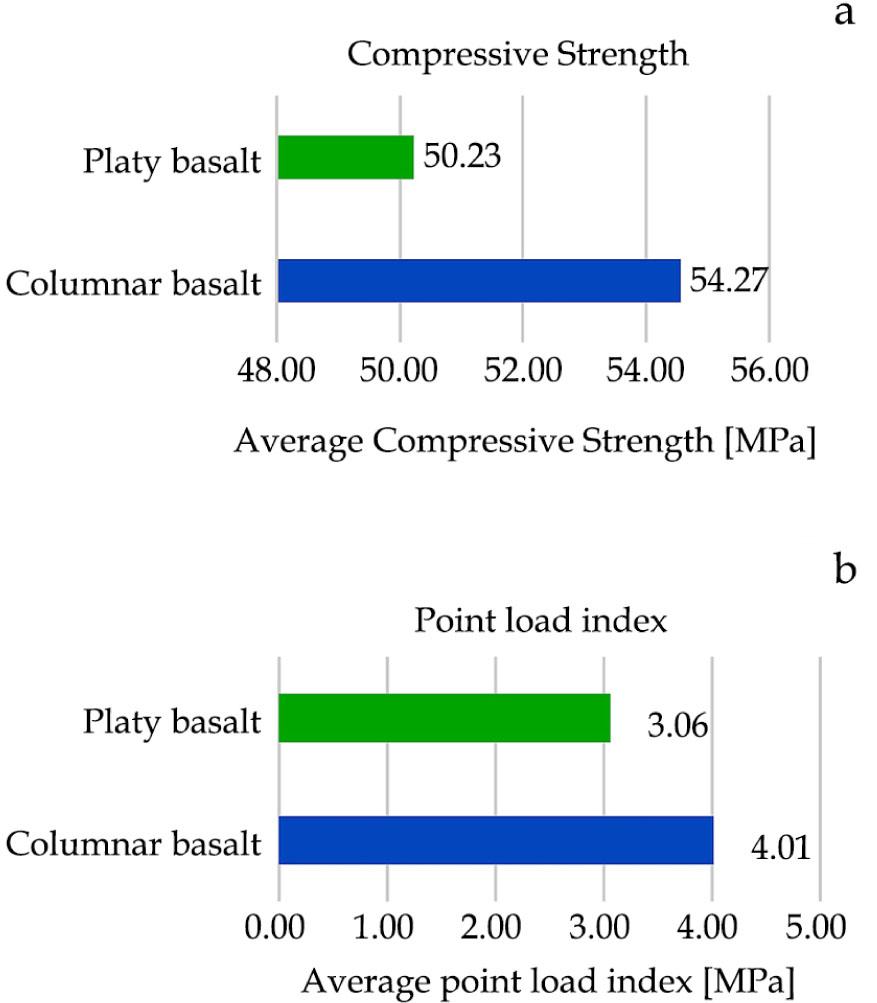 Geological engineering data a – the average CS and b – the point load index of studied basalts. CS, compressive strength.