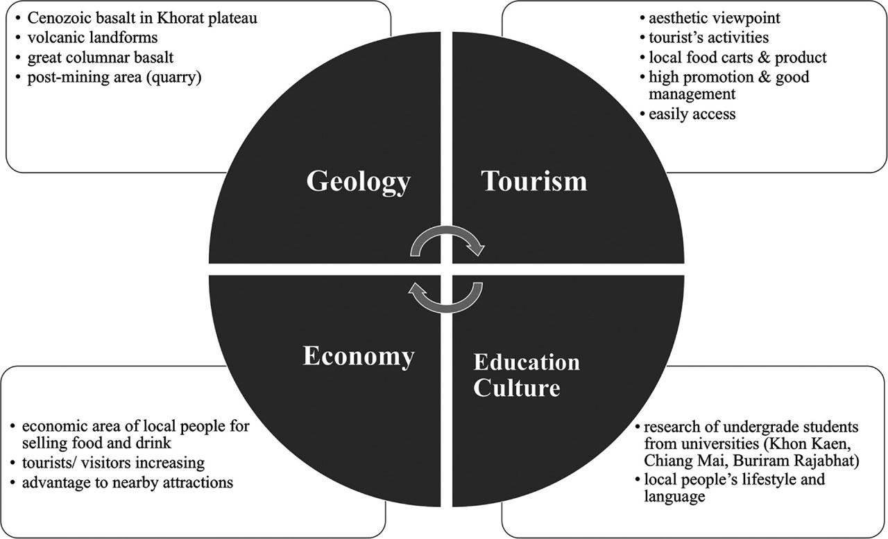 According to the assessment, the Nang Rong Columnar Jointed Basalts shows some strengths and opportunities in SWOT analysis (Fig. 9). There are shortcomings such as lack of geoscientific data and no explanatory boards as well as the presence of the panel of scientists who can provide quality information for visitors to understand geology and earth's process in the area. However, this area is suitable for post-mining prototypes and could increase research in pure geology (i.e. petrology, mineralogy, geochemistry and geomorphology) and applied geology (i.e. engineering geology, hydrogeology, geotourism, mining geology and environmental management) through their identity, rarity and representativeness. The geoeducation activities can be developed and created for educating local people and schools to realise and conserve their geological monuments. During the years 2020–2021, the COVID-19 (Coronavirus disease) pandemic affected the tourism industry in this region, that resulted in economic losses. In addition, threat from natural disasters such as flooding in the rainy season, prevented visitors not to see any columnar basalt.