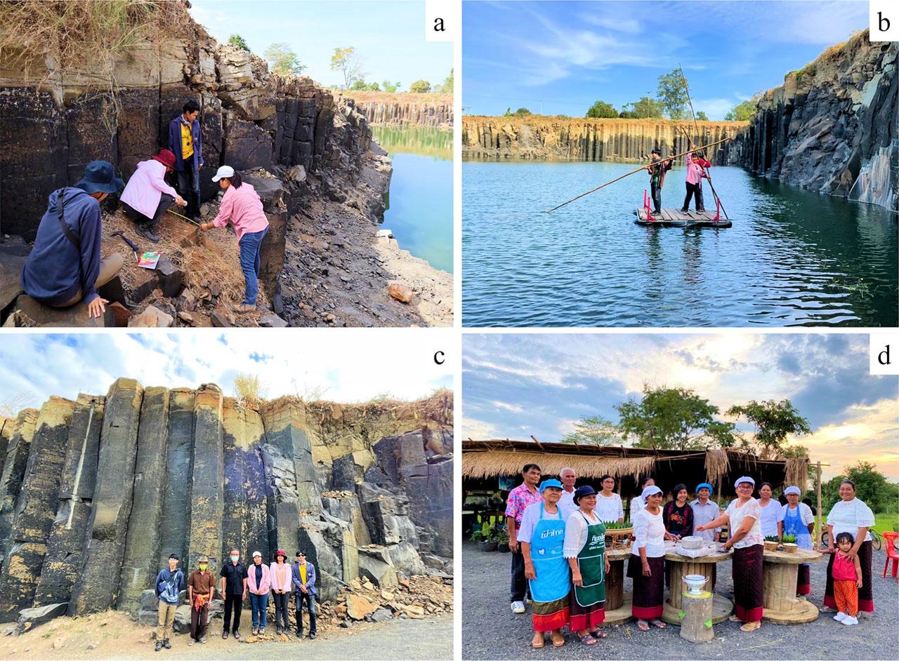 The columnar basalt in Nang Rong displays many values, especially geology, tourism, economy, education and culture (Fig. 7). The area is the greatest columnar basalt and significant volcanic landforms, which erupted during the Cenozoic period on the Khorat plateau (Fig. 1). According to the strength, the basalt terrain in Buriram was exploded for rock quarry for construction in the past. Thus, this area is the post-mining area that should be developed for a good environment and better livelihood of local people nowadays, similar to basalt quarrying sites in England, France, New Zealand, Poland and Spain as well as Su Nuraxi di Barumini, the World Heritage Site in Italy (Maria Mateos et al. 2011, Migoń, Pijet-Migoń 2016, Prosser 2018, Careddu, Grillo 2019, Comentale 2019, Nemeth et al. 2021). Many undergraduate students from various universities (Khon Kaen, Chiang Mai, Buriram Rajabhat universities) come to research this post-mining area in both geology and tourism to increase educational value (Fig. 8a). The Nang Rong Columnar Jointed Basalts presents many points about tourism values, especially management and promotion. This area contains an aesthetic viewpoint that magnetizes tourists to visit and join photograph and rafting (a pastime of travelling down a pond on a raft, which is made from bamboos and tyres) activities from August to January (Fig. 8b). Local authorities, government organisations, and universities have many connections and cooperation in planning the developed strategies (Fig. 8c). Local people create their shops to sell local foods, drinks and products related to the volcano and volcanic rocks (Fig. 8d). During the years 2020–2021, the tourists mass can rapidly develop an economic scheme and increase the advantage to nearby attractions. Visitors can learn the local people's lifestyle and their unique language that present a very symphonic ‘Isan’ language (words and accent (smooth) difference from other Thai languages). There are many historical sites and volcanic landforms not far from this area (<10 km). In addition, local people try to produce their own products ‘geofood’ such as rice planted in volcanic soil, lava durian, and Pha Phu Akanee fabric dyeing volcanic soil.