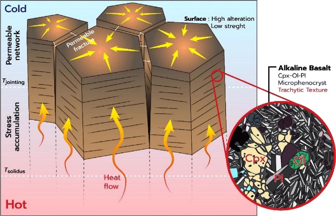 Nang Rong Columnar basalt presents a porphyritic texture with olivine microphenocrysts. Platy basalt has the number of olivine microphenocrysts, slightly altered to iddingsite more significant than columnar basalt. Major oxides classified the studied rocks as basaltic trachyandesite and basaltic andesite, while trace elements determined those as alkaline basalt. The Nang Rong Columnar Jointed Basalts generated from the alkaline-sodic magma series and erupted within the continental plates. Iddingsite 15.70 modal% in platy basalt and 10.06 modal% in columnar basalt (>5.63%), possibly due to the rapid change in the surface temperature of lava, showing a crack and joint. While the temperature inside lava flow is relatively constant, making it a characteristic of the sizeable columnar joint. Thus, the microphenocryst, the primary set of crystallisation and altered to iddingsite, appears abundantly in platy basalt 35.89 modal%. In addition, The petrochemistry of studied basalts supported that significant differences in characteristics were found to affect the strength of both columnar and platy joint types. According to high geological, tourism, and economic values, this Nang Rong columnar basalt is the high potential area for creating a prototype of post-mining geoheritage in Thailand. Geotourism and geoeducation can be developed through the recent trend of touristic activities among visitors, managed by local people.