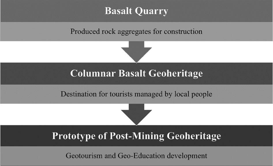 This area presents three essential stages for geoheritage development, as shown in Figure 11. The first stage is the basalt quarry that produced rock aggregates for construction in the past. This stage describes georesources management in Buriram province, where people primarily use basalt for construction, which is different from other regions in Thailand where they use limestone (data from Nationwide mining license information of Department of Primary Industries and Mines 2009). After mining activities, the area becomes the columnar basalt geoheritage and impress visitors in geological phenomena. Many tourists call this area as ‘Grand Canyon Buriram’ in Thai and denominate this area similar to Iceland (data from Google Trend 2020–2021). So, this area is a famous destination for tourists managed by local people and is promoted by many tourists via Facebook pages, personal blocks and webpages. The Ban Khok Makha Ron, Sadao Sub-district, Nang Rong District, Buriram province is supported by local authorities, researchers, and government organisations for developing local people and communities toward sustainability via Community-Based Tourism (CBT). Thus, the studied area is presently suitable to be the prototype of post-mining geoheritage. Geotourism and geo-education development will be developed through tourist activities i.e. Thai geologist's travel trip shared their knowledge in social media, and many people quickly access geological knowledge of Nang Rong Columnar Jointed Basalts. This work can be an excellent example for developing the post-mining area in geoeducation model by cooperation between local people, local authorities and researchers from universities via research, field trips and related activities, even in recreation and business schemes.
