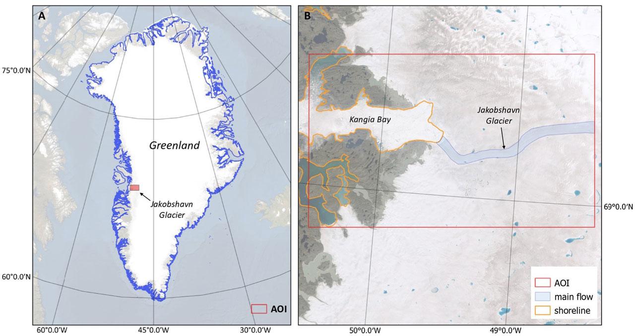 Location of the area of interest (AOI): A) position of the Jakobshavn glacier on the Greenland map, B) precise location of the glacier near Kangia Bay.