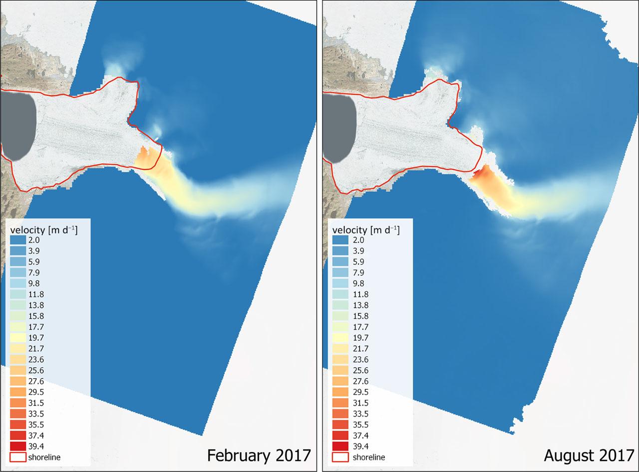 The spatial distribution of displacements for these periods is similar. The glacier terminus slightly retreats in the summer months and the velocities are higher. In August, the maximum velocity reaches more than 39 m d−1, while during February it is about 31 m d−1. The greatest velocities are near the terminus position.