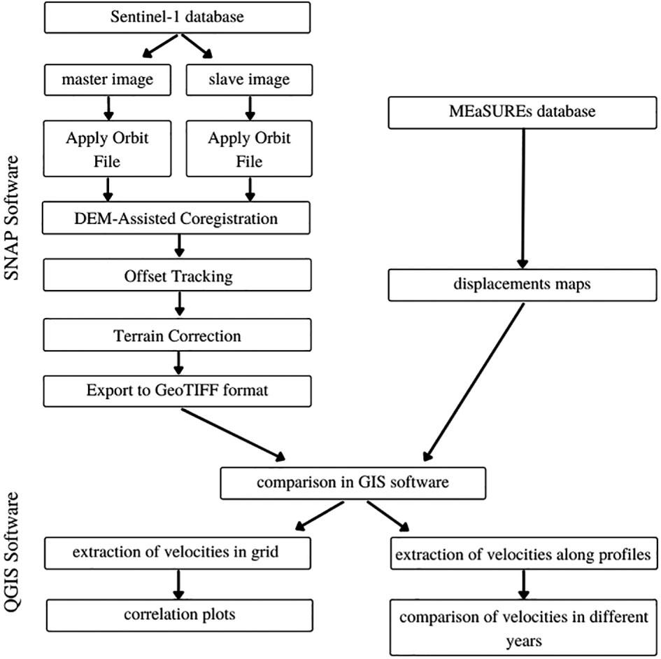 In the first step of processing, for each Sentinel-1 image, a file containing information about precise orbits was attached. In the next step, the pairs of the SAR images were co-registered using the digital terrain model ACE30. Afterward, the offset-tracking procedure was applied. The corresponding pixels were searched in both SAR intensity images. The search area was determined by the size of the registration window, which depends on the maximum velocity which can occur in the selected region and the time interval between images. In those limited areas, corresponding points, called Ground Control Points (GCP), are searched. In a further step, distances between these points are calculated in range and azimuth direction, and therefore maximum velocities and their directions are computed. In the last step of processing in the SNAP software, the terrain correction was applied. Georeferenced displacement maps were exported into GeoTIFF format.