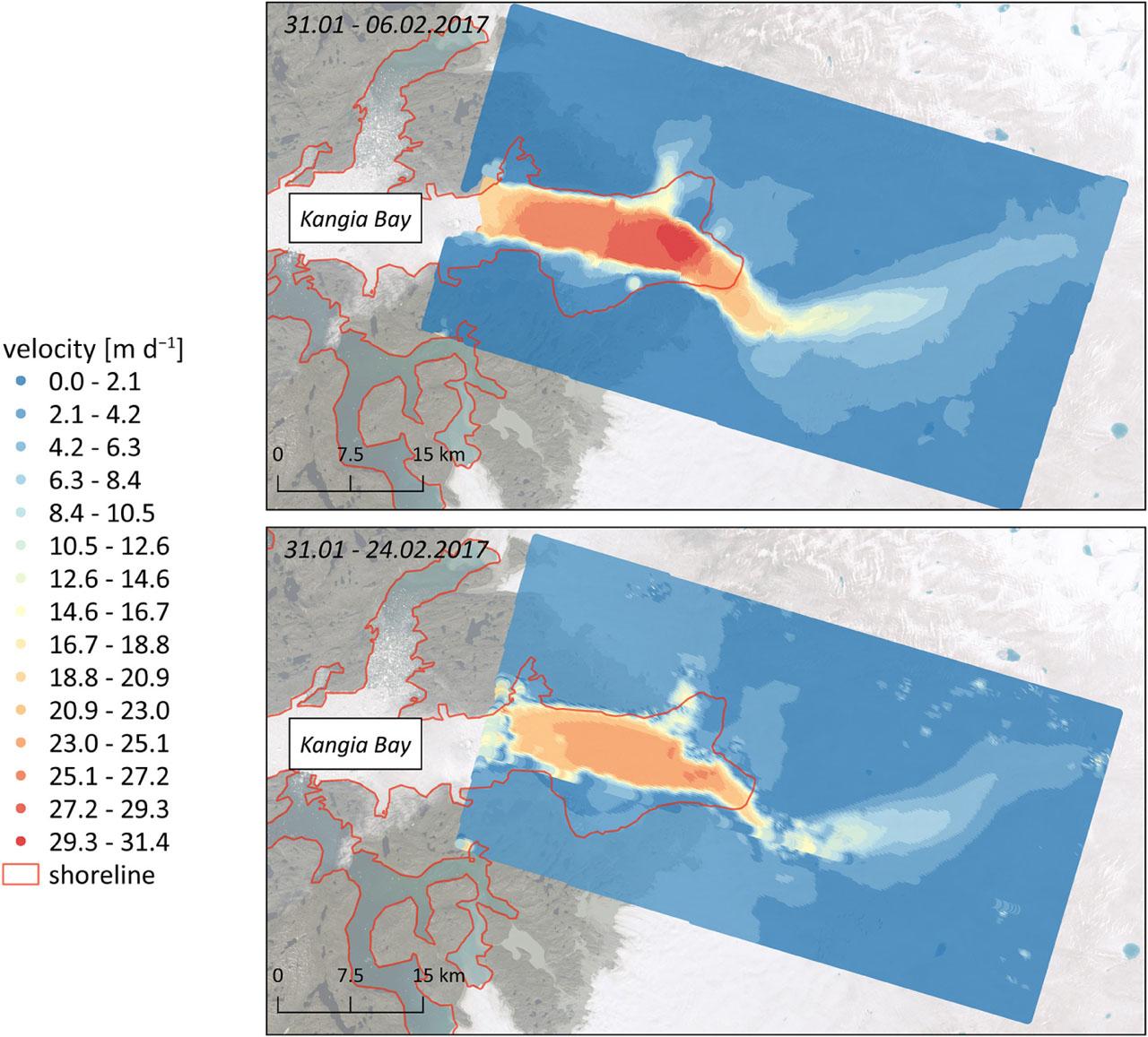 In February 2017, two calculating intervals were tested to check the influence of time baseline on the quality of the obtained results. The velocities were calculated at 6- and 24-day intervals. For both periods, the area of detected movements also covers part of the sea-ice floating in the Kangia Bay. For a shorter time baseline, the maximum glacier speed is 31.4 m d−1 and in the longer interval, it reaches 27.5 m d−1. For a 24-day period, velocities are lower in the whole area of the Jakobshavn glacier. Moreover, the continuity of results is disturbed, and more noises appear. The maximum values appear near the terminus but there is no visible cut-off between the glacier tongue and sea-ice cover.