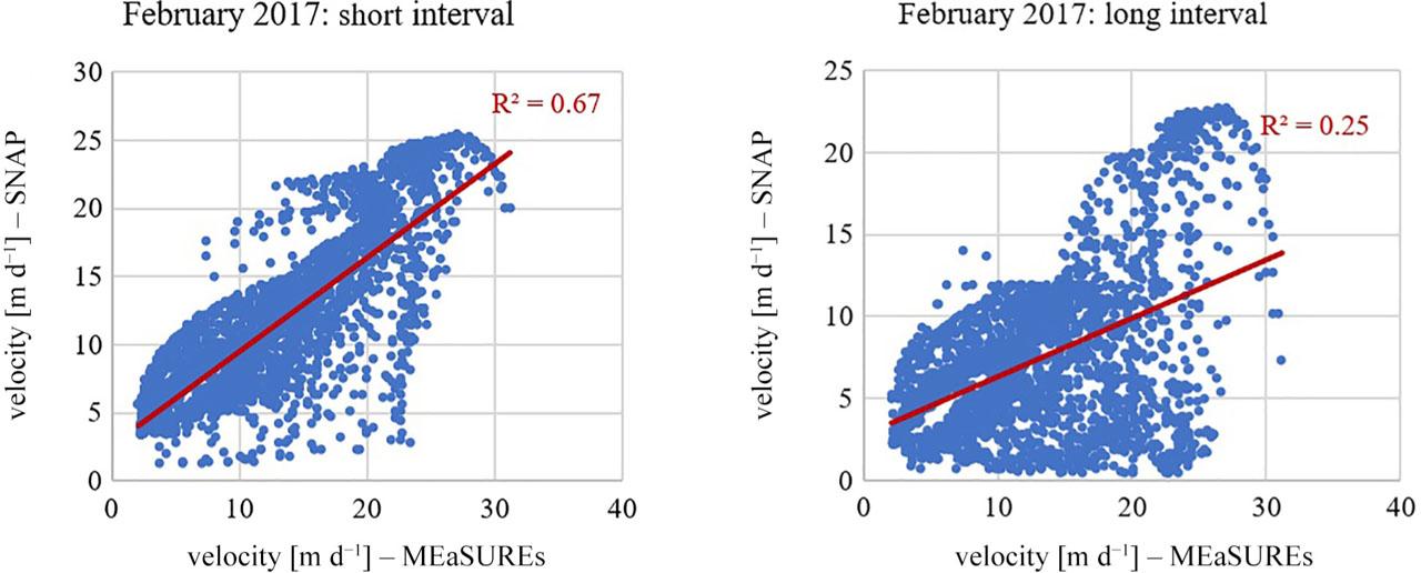 The results of the calculations in both intervals were compared with the velocities from the MEaSUREs database. The correlation plots were created for each pair (Fig. 5). The correlation coefficient for a long interval is 0.25 and for a 6-day period is 0.67. The correlation plot for the 24-day baseline is characterized by a large dispersion of points. A shorter calculation interval results in a significant increase in R2 value.