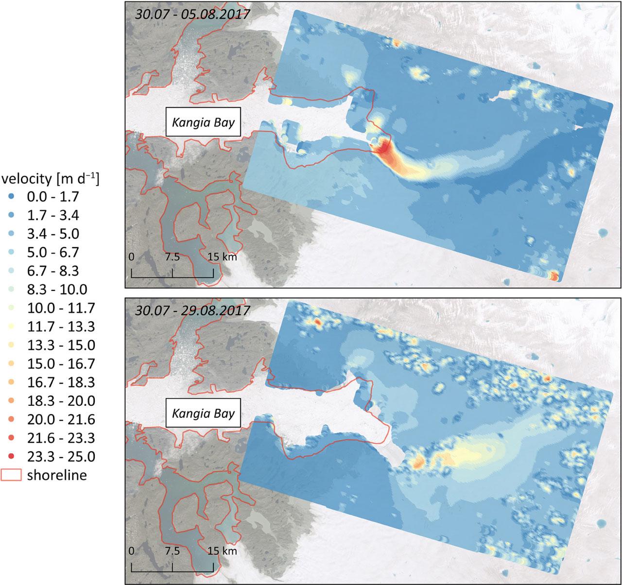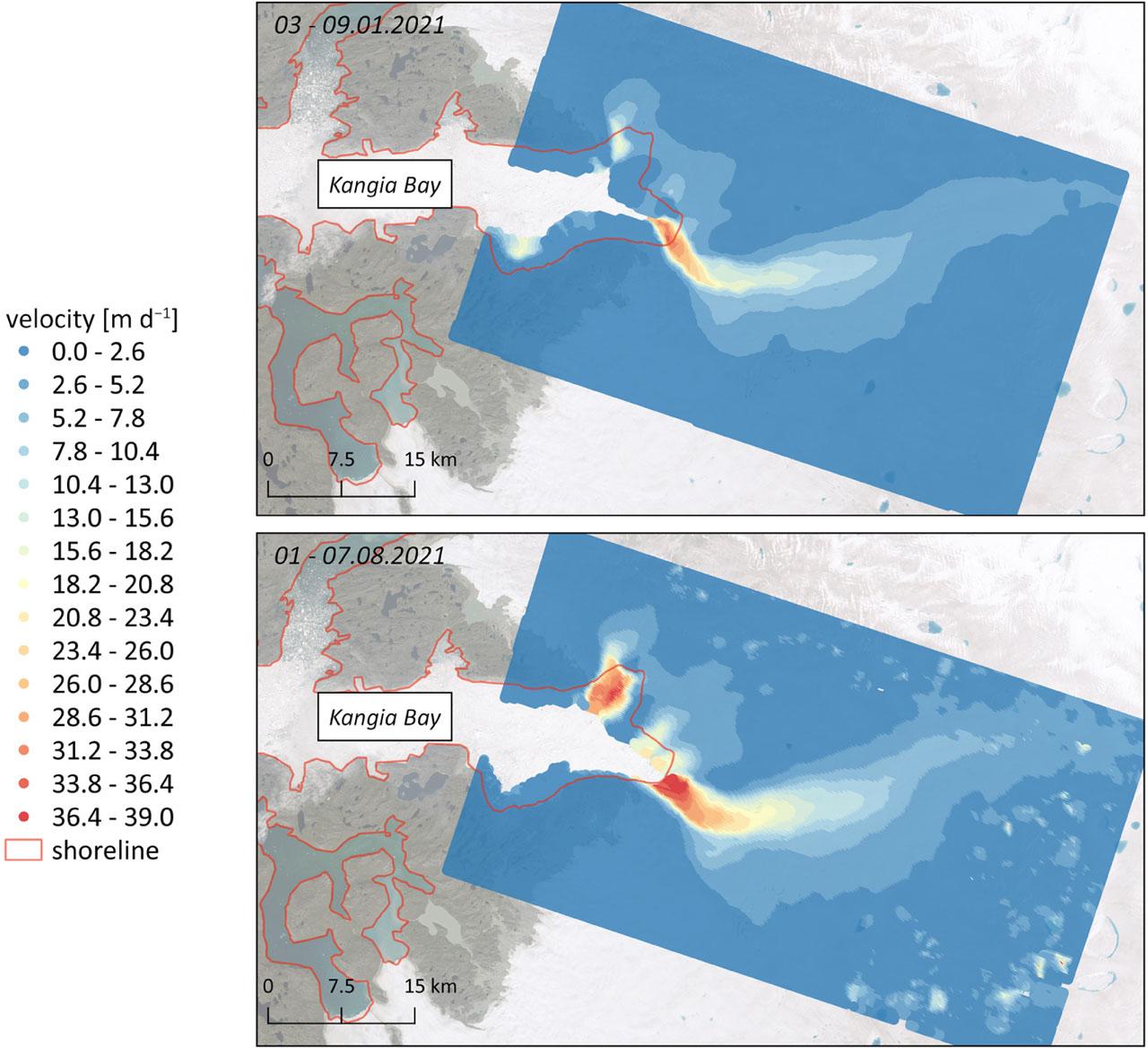 The MEaSUREs database contains information about the velocity of selected glaciers but it is not updated regularly. To obtain information about velocity of glacier in newer period, it was necessary to calculate displacement using only Sentinel-1 data. Tests for 2017 datasets showed that shorter intervals deliver more reliable results, so calculations in winter and summer 2021 were performed at 6-day intervals. The maximum velocities for both seasons are similar. In January, it is 38.0 m d−1 and in August, about 39.0 m d−1 (Fig. 8). However, in the map from summer, it is visible that high displacement values are located in a large part of a glacier located near Kangia Bay. Moreover, data from August 2021 present another small part of moving ice cover in the west-north part of the map. In winter 2021, no significant movements were registered in this part. For both seasons, the spatial distribution of maximum velocities is similar compared to the MEaSUREs database.