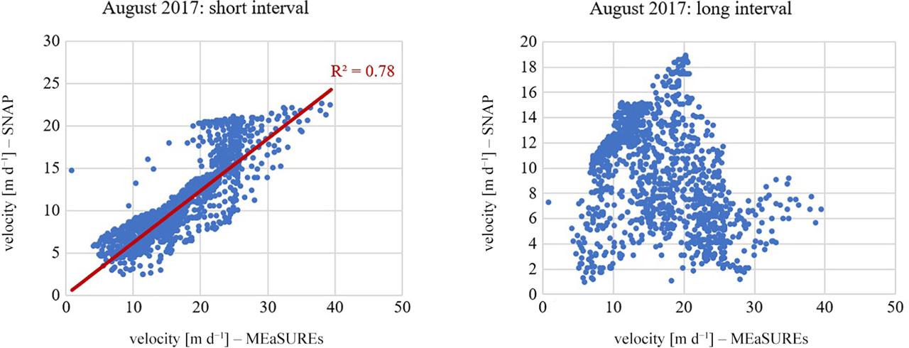For August 2017, velocities were also calculated for two intervals: 6- and 30-days (Fig. 6) and compared to the values from the MEaSUREs database (Fig. 7). A shorter baseline showed a maximum velocity of 25.0 m d−1. The shape of the glacier and the spatial extent of displacements is similar to data presented in the MEaSUREs database. In the map created for a longer period, a large number of noises are visible. It was also impossible to determine velocities near the glacier terminus. The maximum speed is less than 23.0 m d−1. The correlation plots for summer 2017 present similar results to those from the winter (Fig. 7). The 30-day interval shows lack of correlation between velocities from the SNAP and the MEaSUREs database. The correlation coefficient for 6-day calculations is equal to 0.78. For both periods summer and winter 2017, a significant increase in data quality is visible with a shorter time interval. Velocities from 6-day calculation periods show a higher correlation with values from independent datasets. They also contain fewer noises and present more reliable results near the terminus and borders of a glacier. However, for both seasons, Sentinel-1 data present an underestimation of displacement values compared to TerraSAR-X/TanDEM-X results.