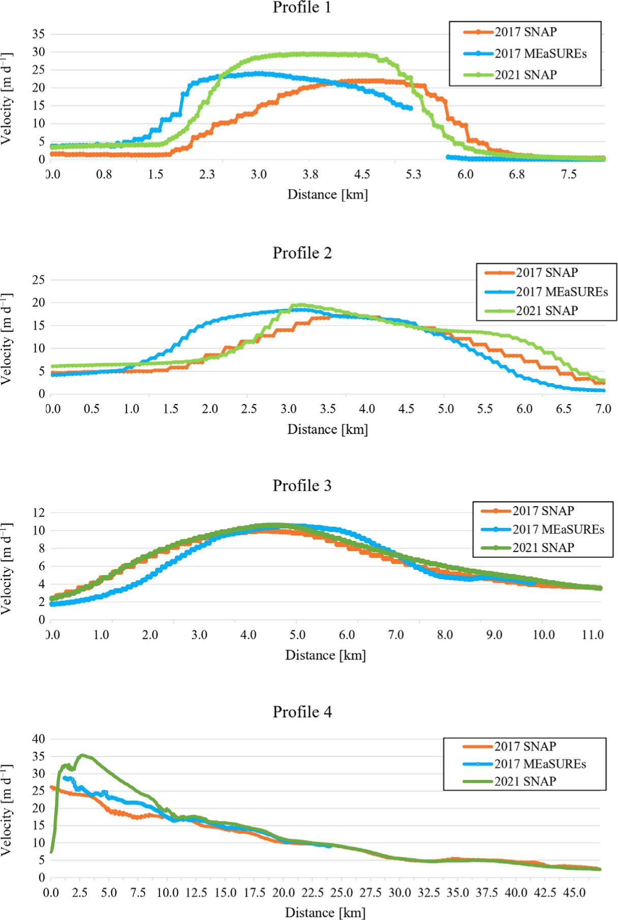 Similar profiles were analyzed for velocities in August 2017 and 2021 (Fig. 11). In each of the 4 profiles, a speedup of the Jakobshavn glacier is visible. However, deviations between SNAP values from 2017 and 2021 are greater than in comparison with MEaSUREs velocities. In the first profile, maximum velocity has changed by almost 20 m d−1 between SNAP calculations. Compared to the MEaSUREs database, the maximum velocity of the glacier increased by almost 10 m d−1. Profiles 2 and 3 also show an increase in velocity values in August 2021. SNAP velocities are higher even about 8–10 m d−1 but comparison with independent database also shows acceleration at the level of a few m d−1. Profile 4, presenting changes in the velocity alongside the main flow of the glacier, shows a speedup along the entire glacier in summer 2021. In the front part of a glacier, the increase in velocity reaches even 20 m d−1. Values from the MEaSUREs database from 2017 show smaller changes in velocity. However, the velocity has changed by almost 10 m d−1 in areas of the greatest velocities.