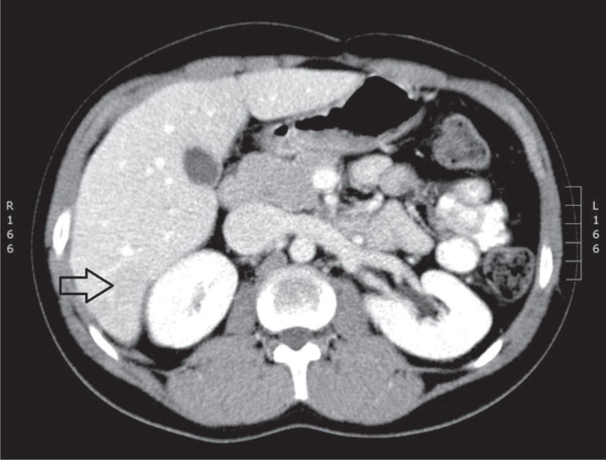 CT; portal phase of contrast enhancement - subtle hypodense lesions in 6th liver segment.