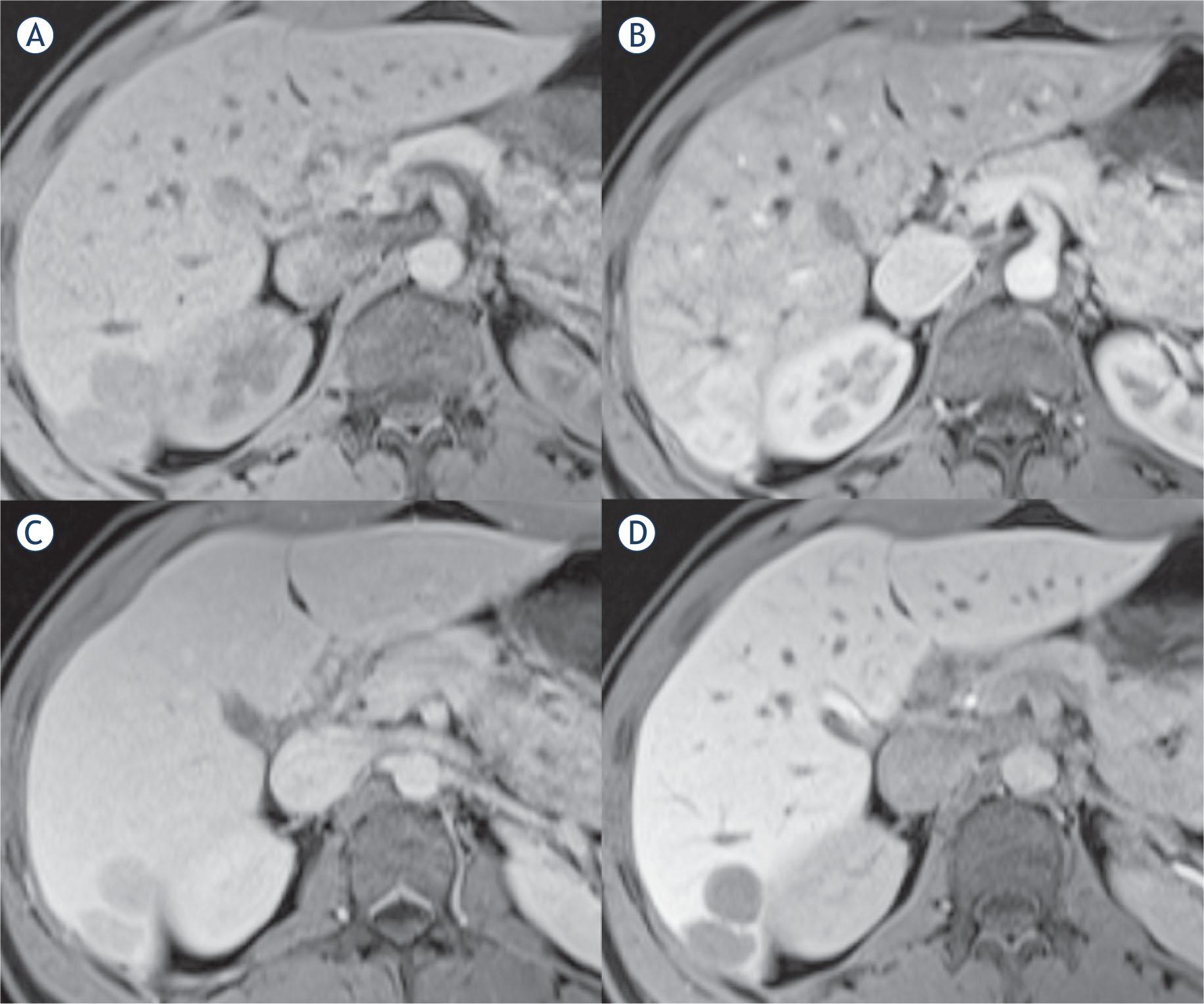 MRI; hepatic lesions in T1 volume interpolated breathhold examination (VIBE) fat saturated (FS); (A) pre-contrast; (B)arterial phase; (C) portal phase; (D) delayed phase (20 minutes) of enhancement.