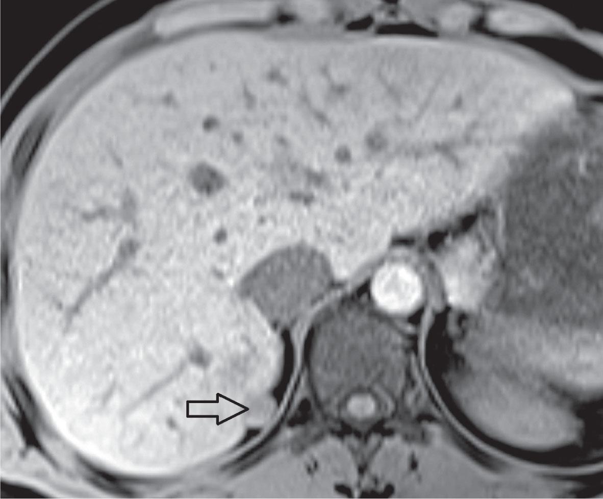 Perihepatic lesion in pre-contrast T1 volume interpolated breathhold examination (VIBE) fat saturated (FS).