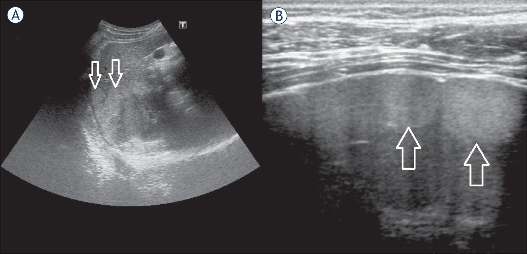 US; mildly hyperechoic subcapsular hepatic lesions; (A)abdominal probe; (B)high frequency linear probe.