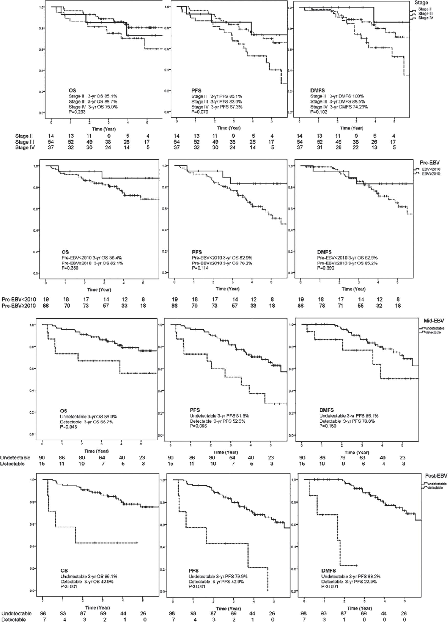 Kaplan -Meier curves for the overall survival (OS), progression-free survival (PFS), distant metastasis-free survival (DMFS) stratified by stage and plasma EBV DNA at different time points.