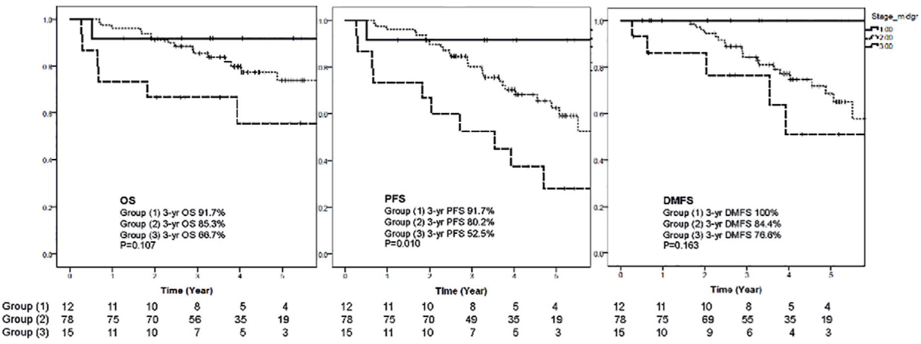 Zhang1 proposed the risk stratification into 4 groups based on the stage and mid-EBV as follows: (1) patients who had stage I-II with undetectable mid-EBV; (2) patients who had stage III-IV with undetectable mid-EBV; (3) patients who had stage II-IV with detectable mid-EBV; and (4) patients who had stage I with detectable mid-EBV. In our study, there were no patients in group (4). Thus, we analyzed the survival in group (1)-(3). The overall survival rates for group (1), (2), and (3) were 91.7%, 85.3% and 66.7%, respectively (p = 0.107), while the PFS rates were 91.7%, 80.2% and 52.5%, respectively (p = 0.010). The corresponding DMFS rates were 100%, 84.4% and 76.6%, respectively (p = 0.163) (Figure 2).
