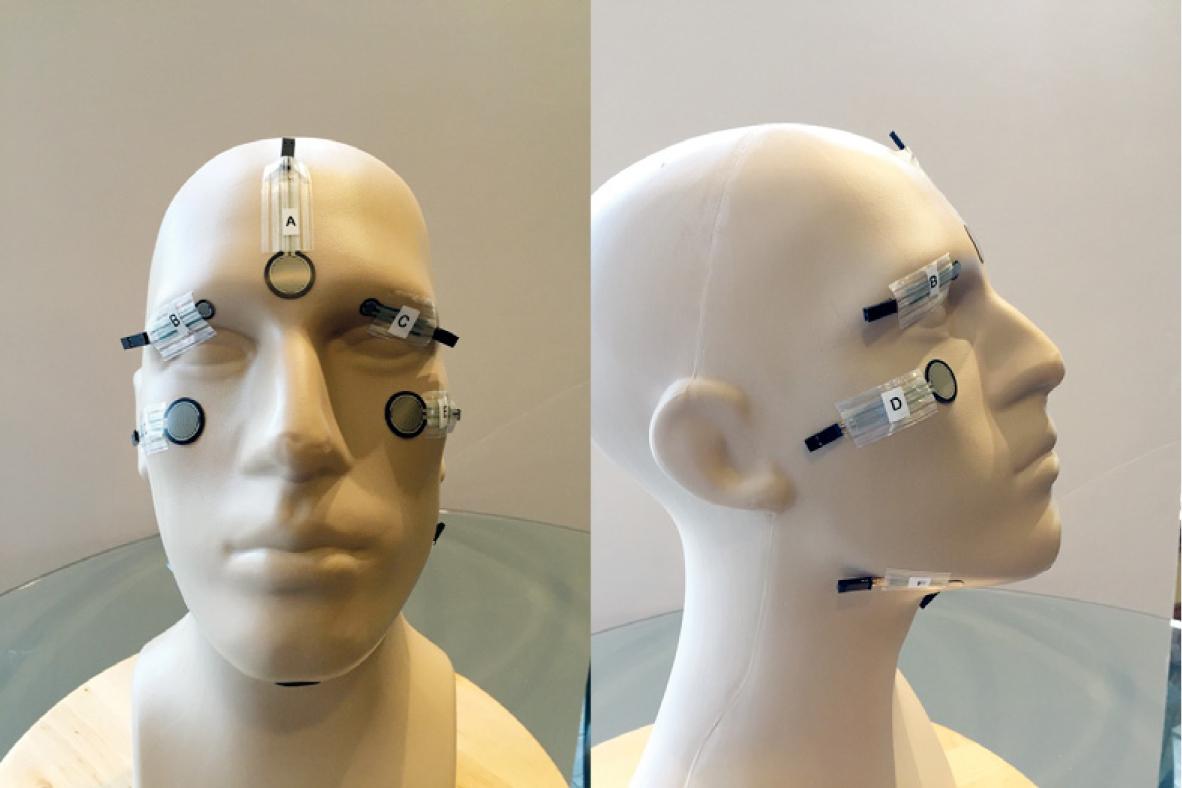 Mannequin with FSR 400 sensors mounted at forehead (A), supra-orbital ridge (B & C), malar eminence (D & E) and chin (F).