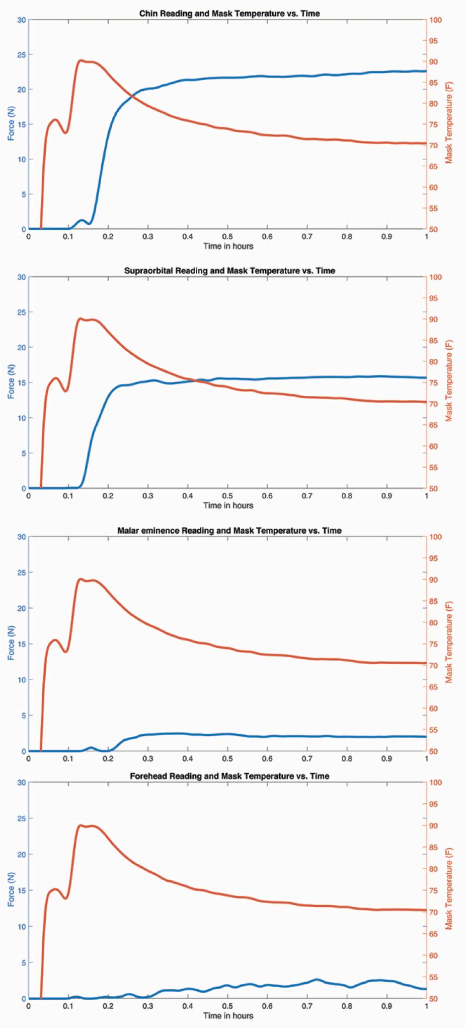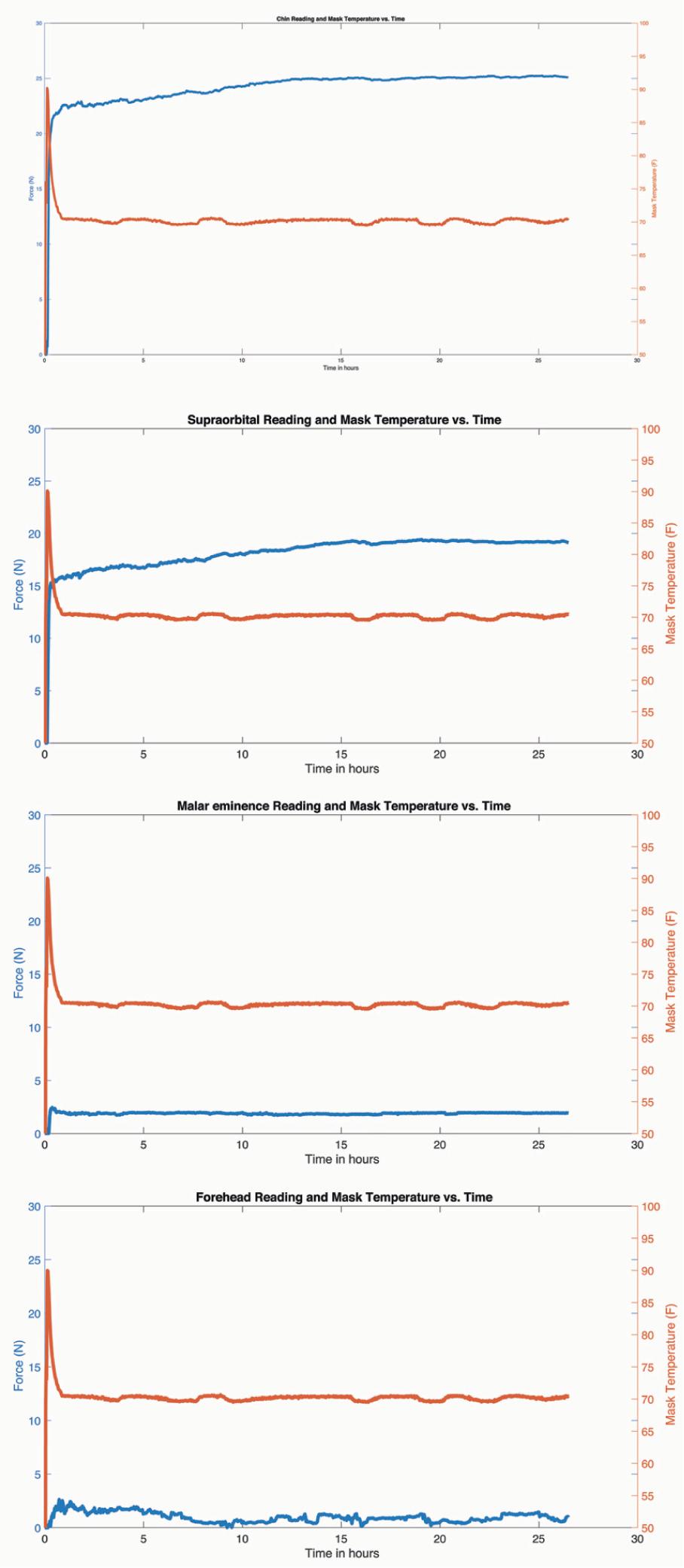 In the first hour of recording (Figure 5) all sensors recorded increasing force at a rapid rate between 2 and 12 minutes and slowed at approximately 24 minutes. Extended force recordings over 24 hours (Figure 6) revealed that force stabilized after approximately 16 hours at the chin and supraorbital regions. The malar eminence and forehead regions reach their peak values within the first hour and then show no further increase.