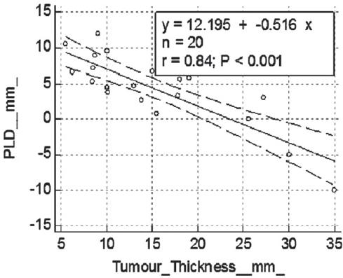 Scatter plot showing strong negative correlation between MR tumour thickness and para-lingual distance (p-value < 0.001 and r = 0.84).