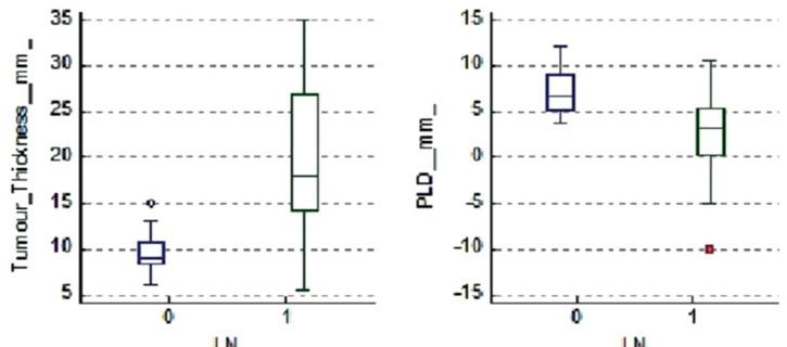 Comparison graphs illustrating the significant differences between tumour thickness and para-lingual distance among nodes positive (N1) and negative (N0) patients (p-values 0.008 and 0.003 respectively).