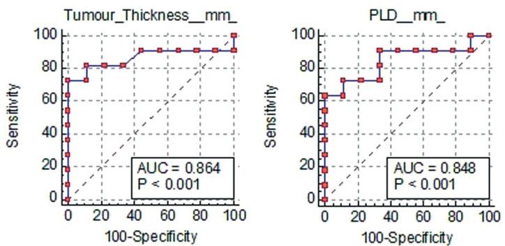 Receiver Operator Characteristic (ROC) curve analyses for tumour thickness and para-lingual distance predicting nodes spread (p-values < 0.001 and AUC 0.864 and 0.848 respectively).
