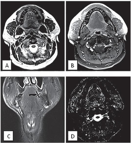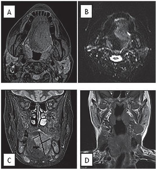 Multiple pulse sequences had been used in previous works to detect small tongue cancers and accurately identify tumour margins, including T2WI, STIR and T1-weighted fat-suppressed contrast-enhanced sequences. Lam et al. reported that particularly contrast-enhanced T1-weighted MRI, provides satisfactory accurate correlation between MRI tumour thickness and histologic tumour thickness in oral tongue cancer.28 Background Diffusion-weighted imaging obtained with magnetic resonance (DW-MRI) is a non-invasive imaging tool potentially able to provide information about micro-structure tumour characteristics.38, 39 The inclusion of DWI/ADC values might be helpful for differentiation between true tumour margin and oedema; and also for distinction between benign and malignant head and neck tumours.20, 21, 40 Multiple studies reported high diagnostic accuracy of DWI for differentiation of malignant from benign status of metastatic cervical lymph nodes.21, 40, 41
