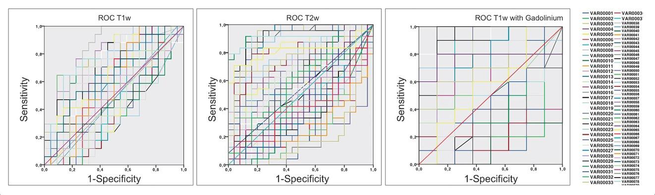 ROC results according to different MRI sequences of the selected features_* T2-weighted MR imaging and T1-weighted MR imaging with Gadolinium are acquired with fat-saturation_ Areas under the curve for differentiation of normal and pathological tissue (LR) had p < 0_05