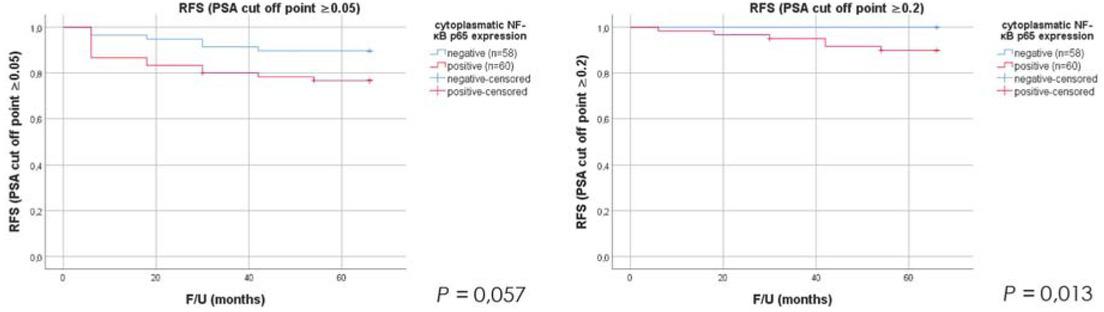 In multivariate analysis only positive surgical margin was significantly associated with worse RFS with a PSA cut off point ≥ 0.05 ng/ml, while postoperative Gleason score 7 and pathologic stage of the disease were not significantly associated with RFS (Table 4). Positive cytoplasmic NF-κB p65 expression negatively affects RFS with borderline statistical significance (p = 0.078). When PSA cut off point was set to ≥ 0.2 ng/ml, none of the prognostic factors was significantly associated with RFS in multivariate analysis.