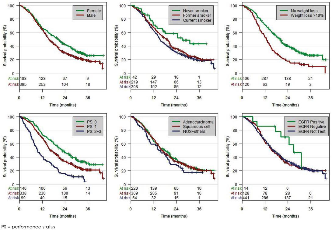 OS and PFS were longer among patients with PS 0–1 and no weight loss (good prognostic group) than among those with PS 2–3 and/or weight loss ≥ 10% (poor prognostic group) (Table 5; Table 6; Figure 3). These differences were observed in the