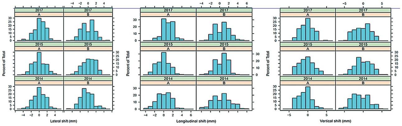 Inter-fraction set-up errors registered in units A and B at different periods are shown in Table 1 and Figure 2. The difference in distribution of interfraction displacements were tested using Mann-Whitney U-test. In four cases, the test showed that the distribution obtained in one year differ significantly (p < 0.05) from those obtained in the other two years. For unit A, set-up error distributions in the vertical direction obtained in 2014 and in the longitudinal direction obtained in 2017 differ from the other two years. For unit B, set-up error distributions in the vertical direction in the year 2014 and in the lateral direction in the year 2014 differ from the other two years. Comparing the vertical shift distribution for the unit A in the years 2014 and 2015 shows significant difference (Mann-Whitney U = 16293, n1 = 187, n2 = 201, p = 0.02, Hodges-Lehmann estimator (HLΔ) = -0.000012, 95% confidence interval (CI) is (-0.999974, -0.000010)). The difference in distributions is even more pronounced between the sets for the year 2014 and 2017 (U = 12918.5, n1 = 187, n2 = 175, p < 0.001, HLΔ = -0.999982, 95% CI (-0.999989, -0.000059). Comparing the distributions for the years 2015 and 2017 did not show a significant difference. Comparing the longitudinal shift distributions for the unit A also doesn’t show a significant difference; however, comparing the distributions for the years 2014 and 2017 does show a significant difference (U = 11230, n1 = 187, n2 = 175, p < 0.001, HLΔ = -0.999982, 95% CI (-1.000066, -0.999956)), and so does the comparison for the years 2015 and 2017 (U = 10171.5, n1 = 201, n2 = 175, p < 0.001, HLΔ = -1.000006, 95% CI (-1.000032, -0.999955)). Neither comparison for the lateral shifts for the unit A showed significance. Comparing the vertical shift distributions for the unit B also shows significant difference between the sets for the years 2014 and 2015 (U = 19637.5, n1 = 227, n2 = 215, p < 0.001, HLΔ = -0.999931, 95% CI (-1.000049, -0.000042)), as well as between the sets for the years 2014 and 2017 (U = 21674, n1 = 227, n2 = 222, p < 0.01, HLΔ = -0.000046, 95% CI (-0.999990, -0.000025)), while the difference between data sets for the years 2015 and 2017 is not significant. In unit B, none of the differences in the longitudinal shift distribution is considered significant. Comparing the lateral shift distributions shows significance between the data sets for the years 2014 and 2015 (U = 18998, n1 = 227, n2 = 215, p < 0.01, HLΔ = -0.999942, 95% CI (-0.999980, -0.000042)) and for the years 2014 and 2017 (U = 22030, n1 = 227, n2 = 222, p < 0.02, HLΔ = -0.000058, 95% CI (-0.999953, -0.000040)), while the distributions of lateral shifts between 2015 and 2017 is not considered significant. Comparing the variances of the distributions (which correspond to the systematic error Σ and the random error σ combined) only shows significant differences in five cases: in unit A the vertical shift distributions for the years 2015 and 2017 differ significantly (Levene’s F = 6.3082, DF = 386, p < 0.02), as well as longitudinal shift distributions for the years 2014 and 2017 (F = 9.2817, DF = 360, p < 0.01). In unit B, all three comparisons of longitudinal shift distributions show significant difference: between the sets for 2014 and 2015 (F = 24.5077, DF = 440, p < 0.001), between the sets for 2014 and 2017 (F = 9.1372, DF = 447, p < 0.01), and between the sets for 2015 and 2017 (F = 4.5802, DF = 435, p = 0.03). In Table 2, the number of IC displacements for both units together at different periods are presented, as well as the number of recorded gross errors (> 5 mm). Most of the IC shifts were made in the posterior, inferior and in the left direction. With the implementation of individual head supports, their number decreased, except for the lateral direction, and the number of gross errors was also reduced.