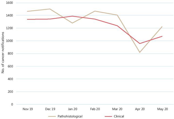 The Slovenian Cancer Registry is one of the oldest cancer registries in Europe, operating since 1950. In 2018, the transition from passive to active registration started, which allows for up-to-date data on cancer notifications. This is an important feature, considering the need for real-time analysis of data to be able to inform decision-makers regarding the measures for COVID-19 control. From the Cancer Registry, we extracted data on monthly cancer notifications from the two major oncological centres in Slovenia, the Institute of Oncology Ljubljana and the University Medical Centre Maribor which are included in the active registration. The Ljubljana and Maribor oncological centres cover a major part of newly diagnosed cancers in Slovenia. Two types of cancer notifications were evaluated: those from pathohistological departments and those from clinical setting.