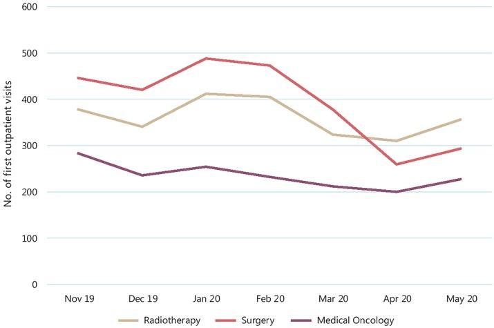 Outpatient visits to oncological centres must have declined across Europe, though we could not find any already published European study which reported on the number of cancer outpatient visits. A report from the US shows that oncology outpatient visits had fallen by as much as 47% in April 2020.17