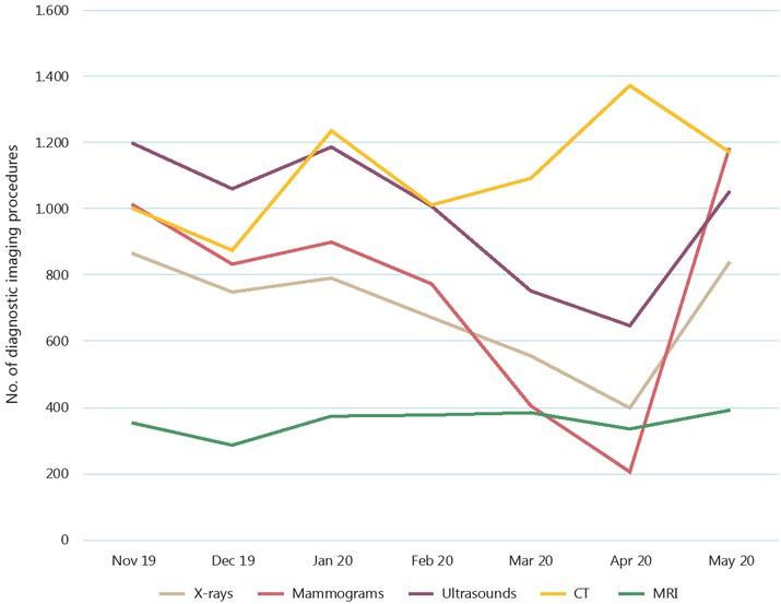 Regarding diagnostic imaging, in April 2020 compared to the November 2019 – February 2020 average, there were also significant reductions in X-rays (48%), mammograms (76%) and ultrasounds (42%) performed at the Institute. This could again point to fewer patients being in the diagnostic process though there were changes in the functioning of the Institute that could also have contributed to this result. The numbers of CT and MRI scans were not affected. The reduction in diagnostic imaging was thus most pronounced for mammography, which is only in part linked to the suspension of breast cancer screening, as mammograms within the screening programme are tallied separately.